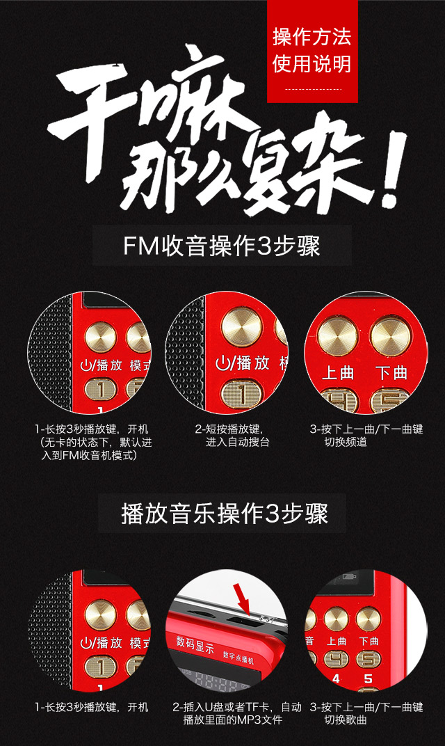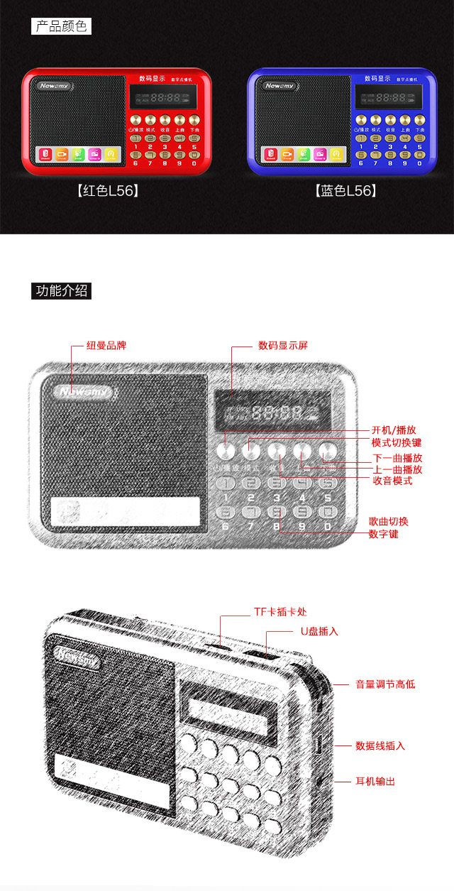 外观款式:便携手持;使用功能:随身收音机;波段规格:FM/调频;调谐方式:数字显示,自动搜台;辅助功能:时钟显示;电源规格:内置锂电池;品牌:纽曼(Newsmy);类别:数字显示收音;颜色:红色;电源:充插两用;外放功能:支持;校园调频:支持;U盘播放:支持;耳机插口:正常;USB插口:正常;包装清单:主机 × 1 USB线 × 1 挂绳 × 1 电池 × 1 使用说明书 × 1;