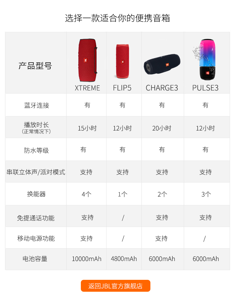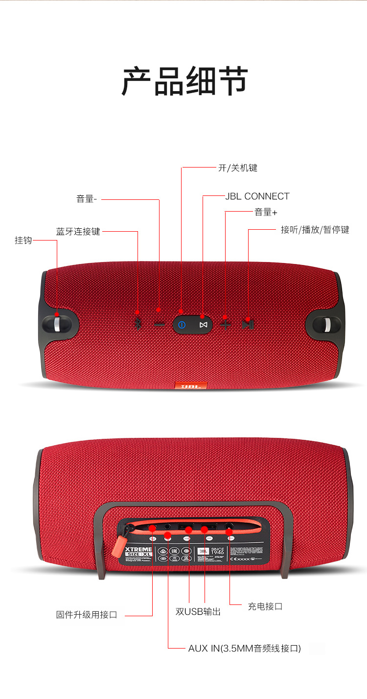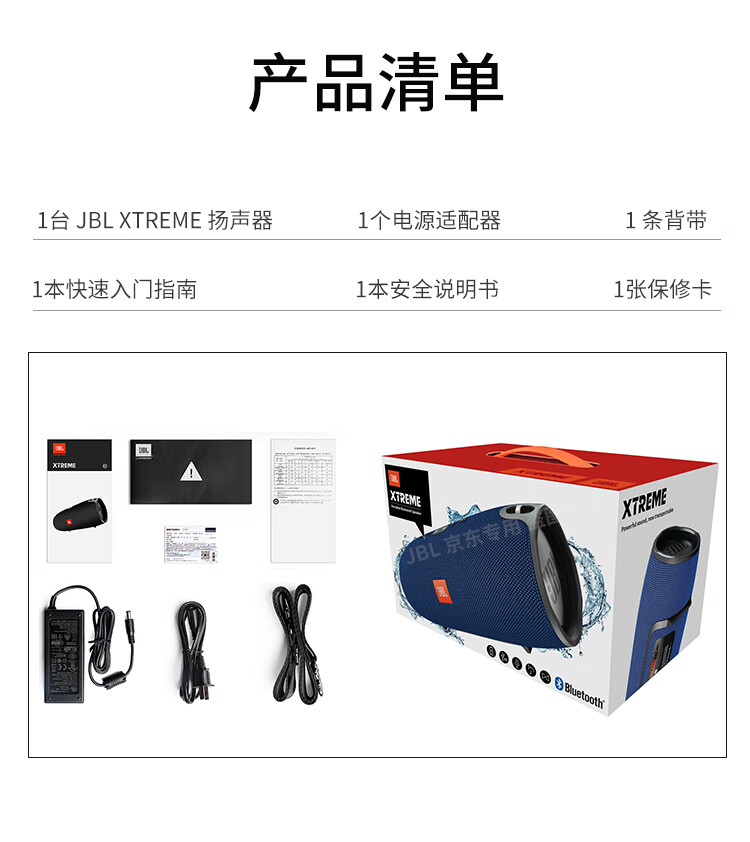 功能:扩音器;适用场景:户外;分类:便携音箱;品牌:JBL;型号:XTREME;认证型号:JBL XTREME;翻新类型:全新;接口:3.5毫米音频接口;音箱控制:按键;电源:电池供电;声道:2.0;类型:多媒体音箱;包装清单:JBL Xtreme 音乐战鼓× 1、 充电器× 1、背带 × 1、说明书 × 1、保修卡 × 1;