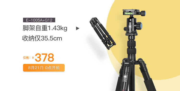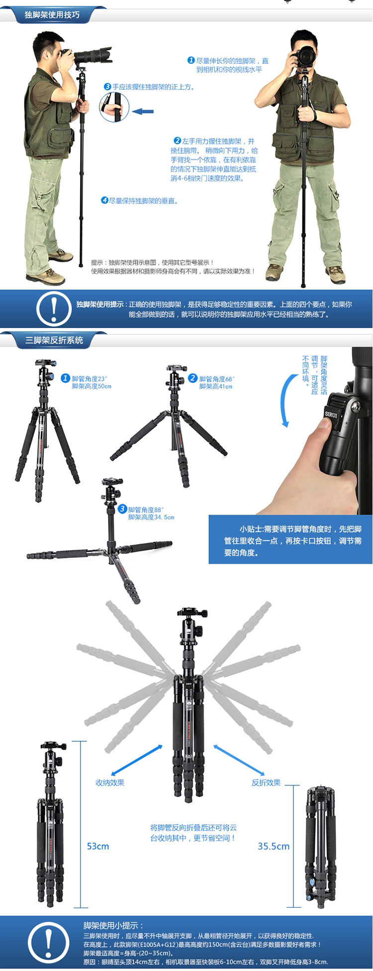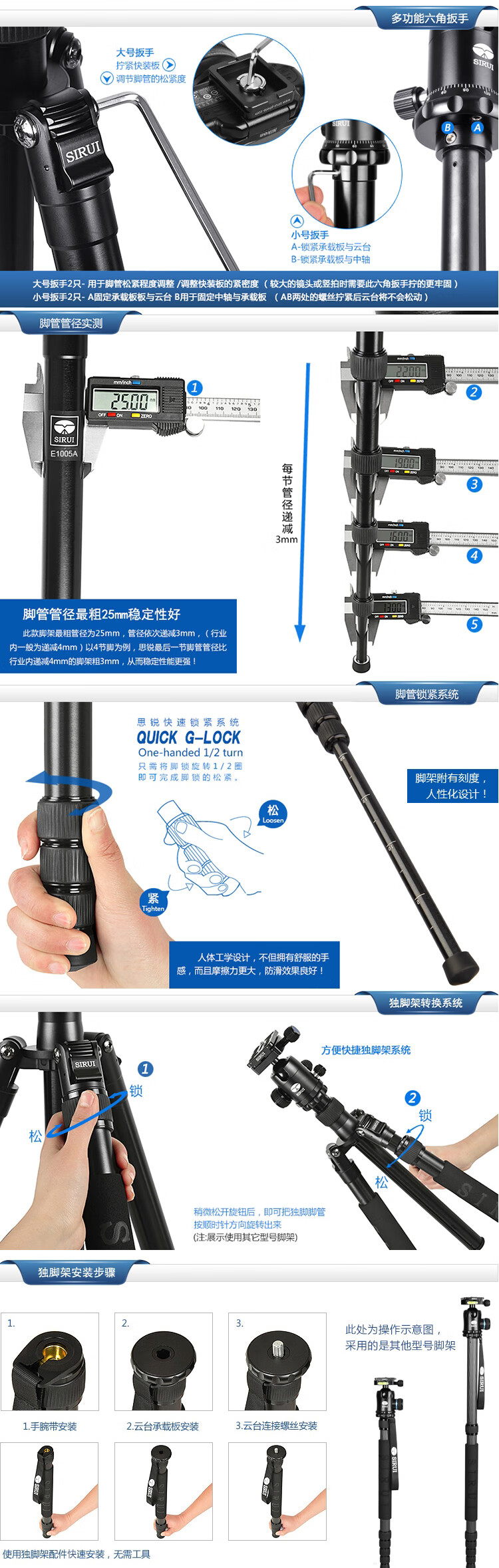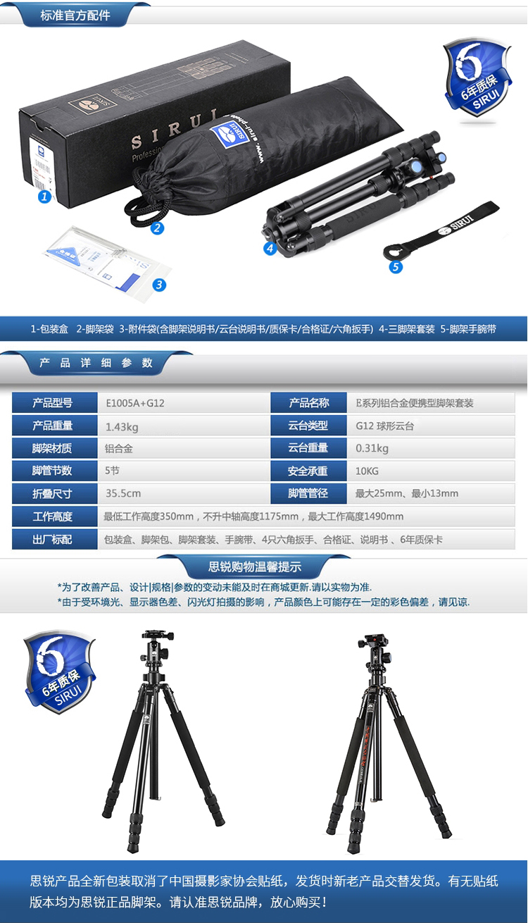 产品类型:脚架+云台套装;节数:5节;承重:6kg-10kg;功能特点:中轴倒置,其他,便携反折,可拆独脚;云台类型:球型云台;产品材质:铝合金;品牌:思锐(SIRUI);颜色:黑色;型号:E1005A+G12;适用机型:单反相机;螺丝尺寸:1/4-3/8通用转换螺丝;承重 即三脚架能承受的相机重量:10KG;自重 即三脚架本身的重量:1.43;最高工作高度:1490mm;最小管径:13mm;最大管径:25mm;最低工作高度:350mm;脚管锁类型:旋钮式;折合高度:355mm;包装清单:【 包装盒x1 脚架袋x1 三脚架(含承载板,中轴挂钩,螺丝)X1 云台(含快装板,螺丝)X1 手腕带X1 配件袋(脚架说明书,云台说明书,质保卡,合格证,六角扳手4只)】;