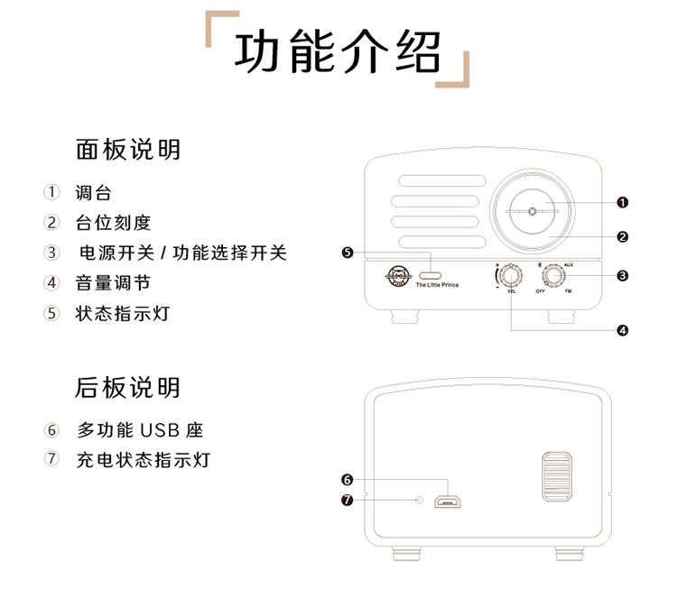 功能:收音机;适用场景:户外;分类:便携音箱;品牌:猫王收音机;材质:木质;型号:MW-2;认证型号:MW-2;翻新类型:全新;产品尺寸(mm):94mm(长度)×55mm(深度含旋钮)×71mm(高度含脚垫);接口:USB接口;音箱控制:旋钮;频响范围:20HZ-20KHZ;电源:电池供电;产品净重(kg):约0.188kg;理论功率:20w以下;信噪比:75db;阻抗:4Ω;类型:多媒体音箱;包装清单:收音机×1,包装盒×1,麻布袋×1,FM拉杆天线×1,折页册×1,USB充电线×1,AUX音频线×1;