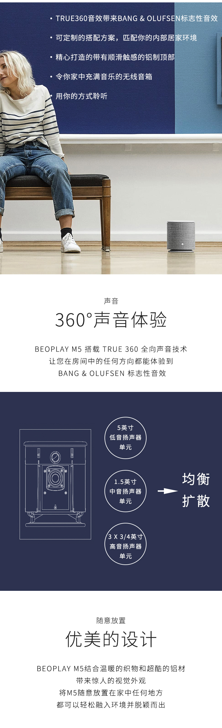 适用场景:居家;分类:便携音箱;认证型号:Beoplay M5;包装清单:Beoplay M5 Kvadrat 面罩 电源线缆;