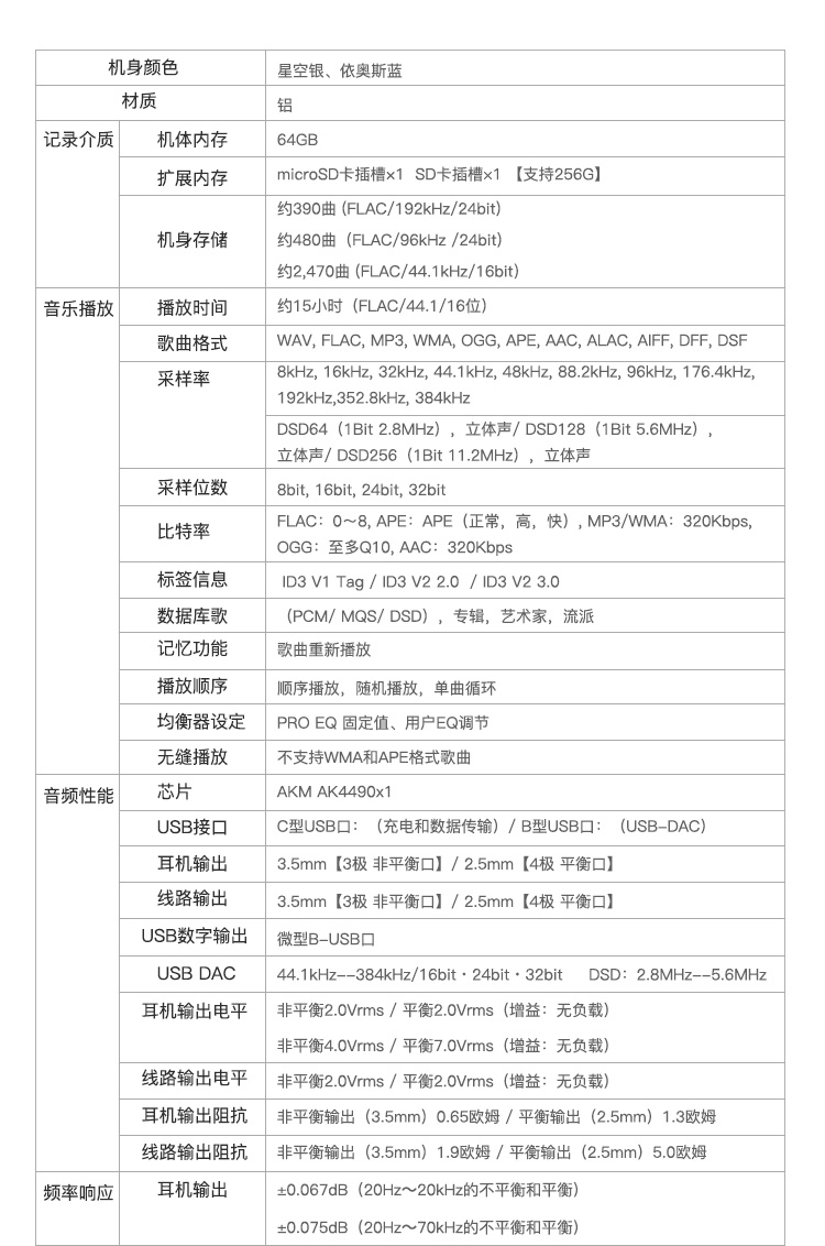 音频播放格式:WMA,WAV,MP3,OGG,AAC,APE,FLAC;附加功能:支持蓝牙,支持WIFI;屏幕尺寸:4英寸;容量:64G以上;类别:HIFI播放器;品牌:艾利和;接口:USB2.0;型号:Astell&Kern KANN;认证型号:PPM41;最大支持容量:256G;类型:TFT彩屏;包装清单:USB线 × 1、 贴膜× 2、说明书 × 1、保修卡 × 1、SD卡槽防尘塞× 2;