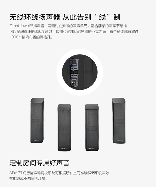 功能:NFC;适用场景:居家;分类:专业/家庭音响;品牌:Bose;型号:Lifestyle 650;认证型号:420128;音箱控制:遥控;声道:5.1;包装清单:控制台× 1、 OmniJewel 扬声器× 4、OmniJewel 中置扬声器× 1、Acoustimass 无线低音箱× 1、通用遥控器× 1、前置扬声器连接线× 1、后置扬声器连接线× 2、中置扬声器连接线× 1、无线接收器× 2、ADAPTiQ 耳机× 1、IR 发射器× 1、HDMI 连接线× 1、AA 电池× 4、控制台电源× 1、电源线× 4、吸附脚× 4、螺丝刀× 1、用户指南× ;