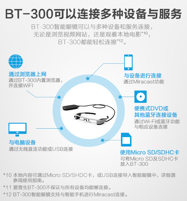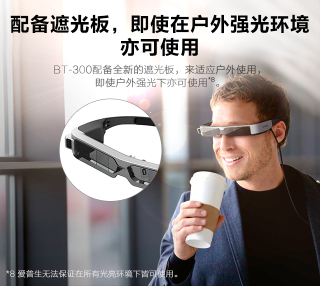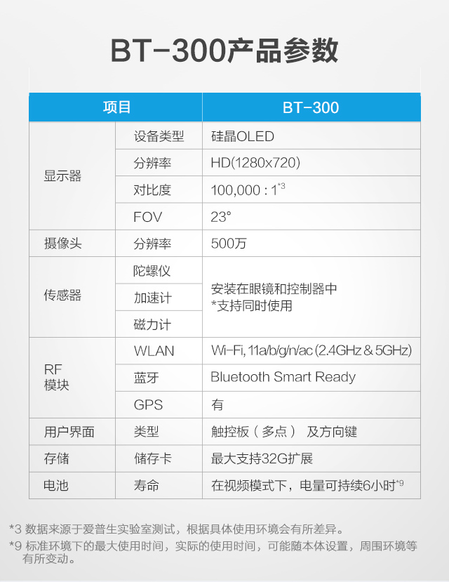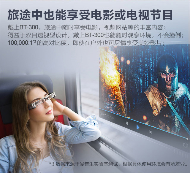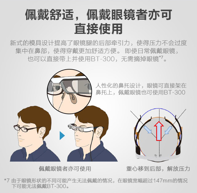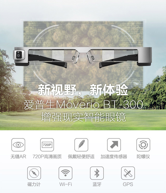 产品类型:AR眼镜;适用人群:追剧达人;延迟率:小于等于20ms;功能热点:看电影;分辨率:720p;应用场景:地铁/动车/高铁/飞机;品牌:爱普生 Epson;颜色:银色+黑色;型号:BT-300;HDMI:无;WIFI:802.11a/b/g/n/ac, Miracast无线直连;机身尺寸:181mm X 193.5mm X 30.5mm(眼镜本体);机身重量:198g;ROM 是只读内存的简称:无;最大存储扩展容量:32G SDHC或Micro SD卡;RAM 随机存取存储器:2GB;视场角:23度;机身宽度:181mm;产品净重(kg):198g(包含控制器)69g(眼镜本体);机身高度:30.5mm;机身材质分类:Mg、PC+ABS、TR90;机身长度:193.5mm;材质:自由曲面镜片;包装清单:AC充电器 X 1、遮光板 X 2、便携包 X 1、眼镜骨架 X 1、Micro-USB线缆 X 1、眼镜腿 X 2、耳机 X 1、普通鼻托 X 1、 眼镜鼻托 X 1、说明书 X 1、保修卡 X 1;