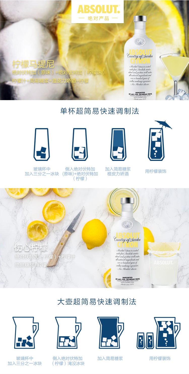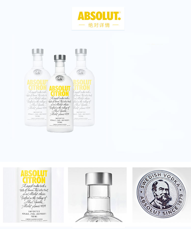 适用场景:家庭聚会,商务宴请,情侣约会,自斟自饮;包装:瓶装;容量:700-999mL;国产/进口:进口;产地:瑞典;原料:水,冬小麦,食用香料(柠檬味);保质期:长期;酒精度:40%vol;存储方法:通风、干燥、阴凉处;容量:700mL;产品重量:1.16kg;包装清单:绝对伏特加(Absolut Vodka)洋酒 柠檬味 伏特加 700ml*1;
