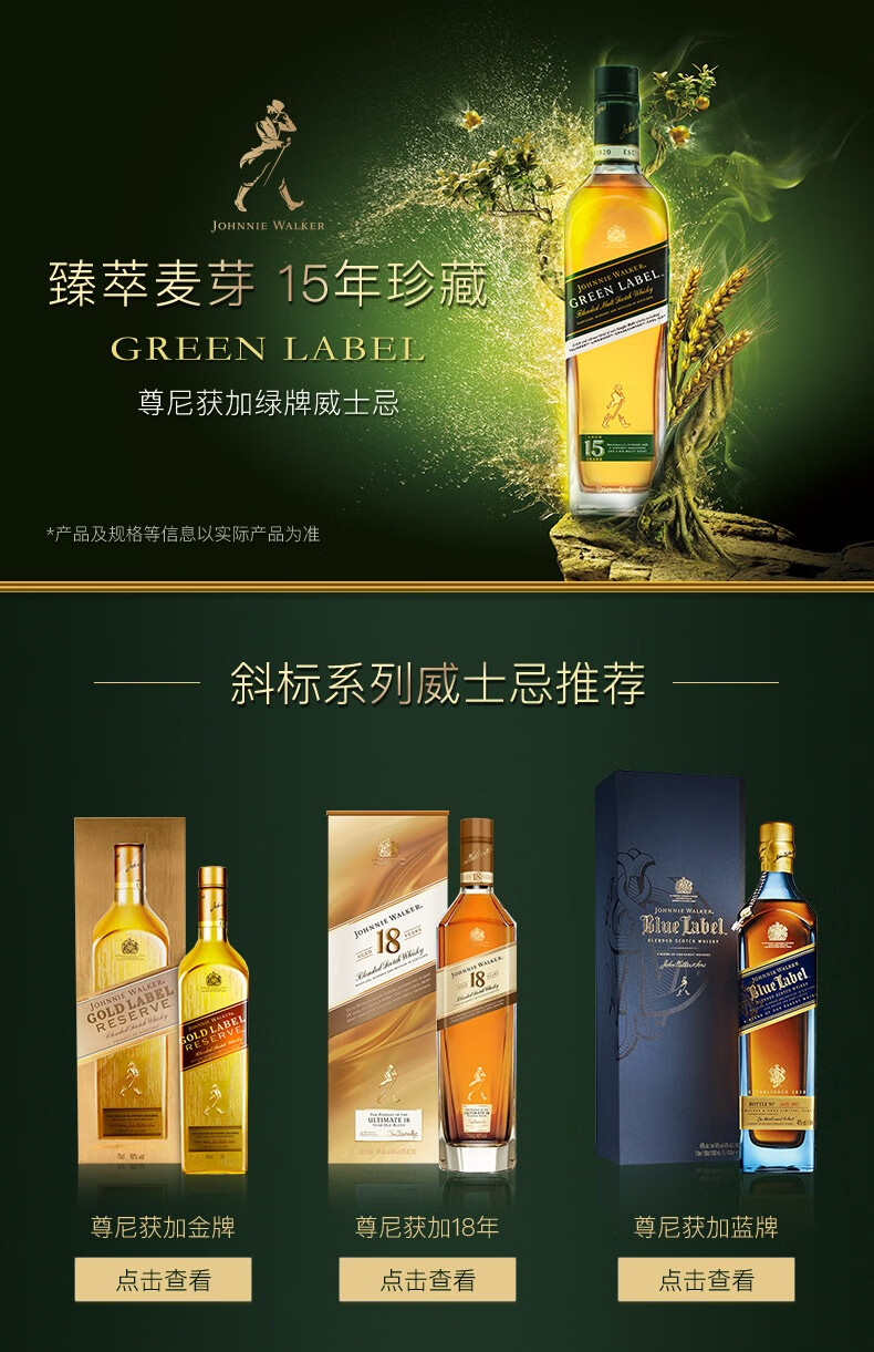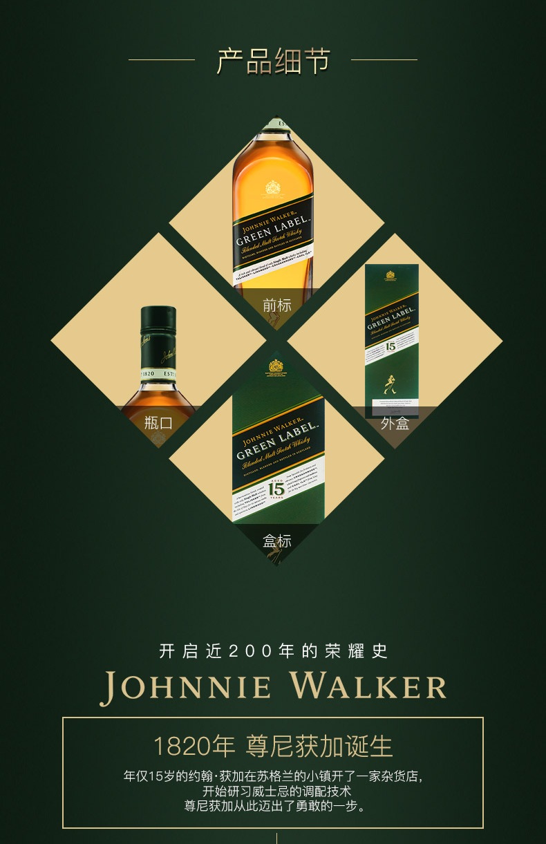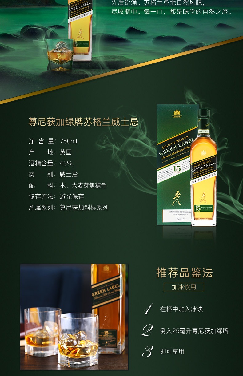 类型:调和威士忌;产地:其它;适用场景:自斟自饮,亲友馈赠,家庭聚会,商务宴请,情侣约会,闺蜜私语;包装:瓶装;容量:700-999mL;阶段:进阶优选;原料:水、大麦芽、焦糖色;保质期:无;酒精度:43%vol;存储方法:常温避光保存;产品重量:1.6kg;容量:750mL;包装清单:尊尼获加(JOHNNIE WALKER)洋酒 绿方 绿牌15年调配麦芽苏格兰威士忌750ml *1;