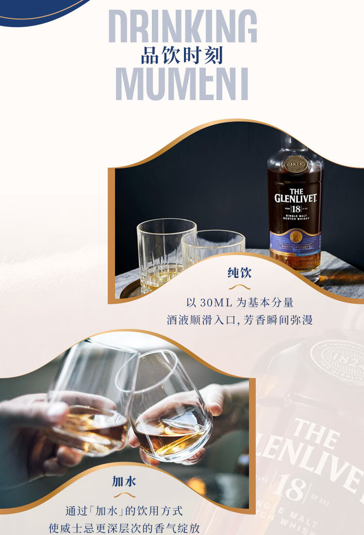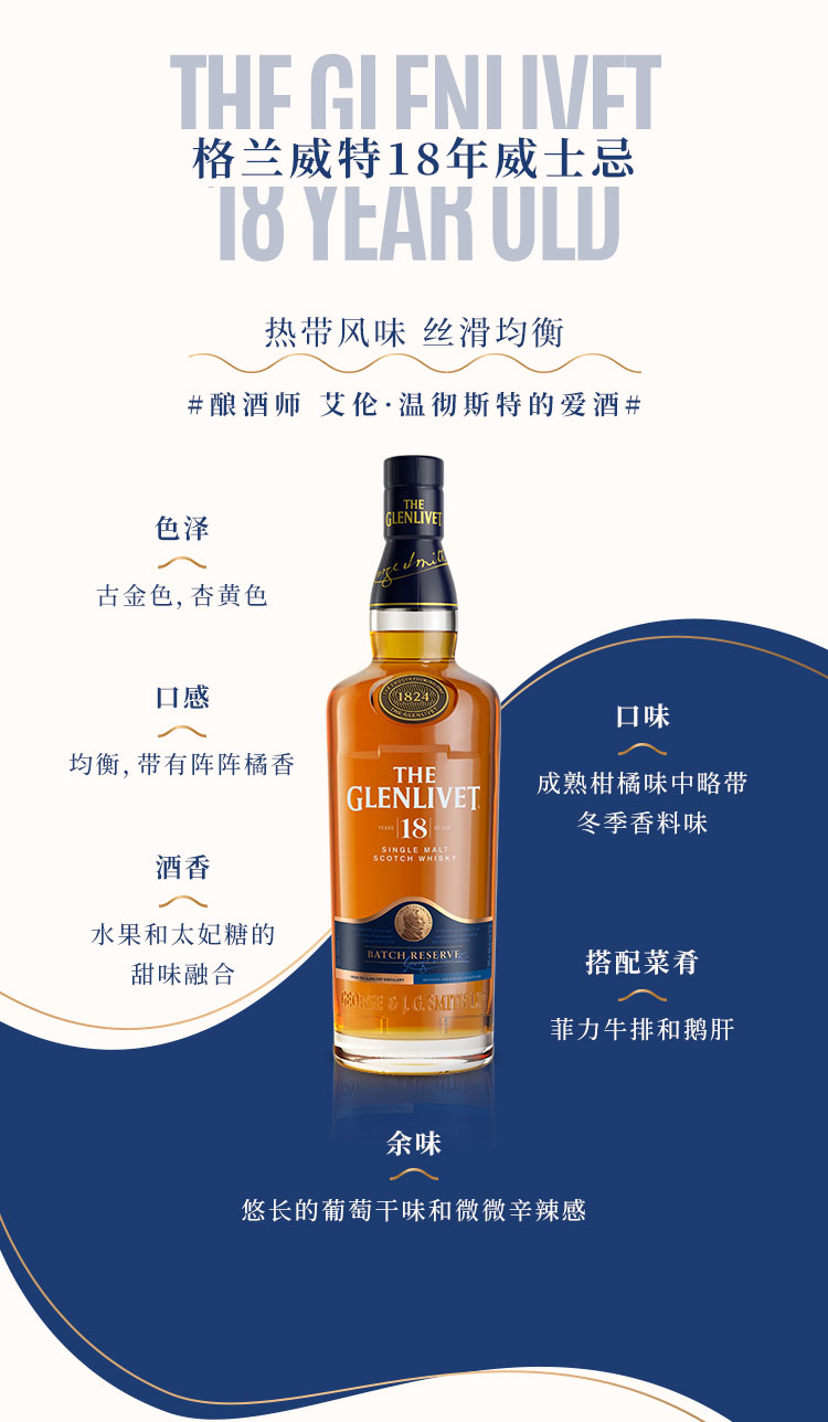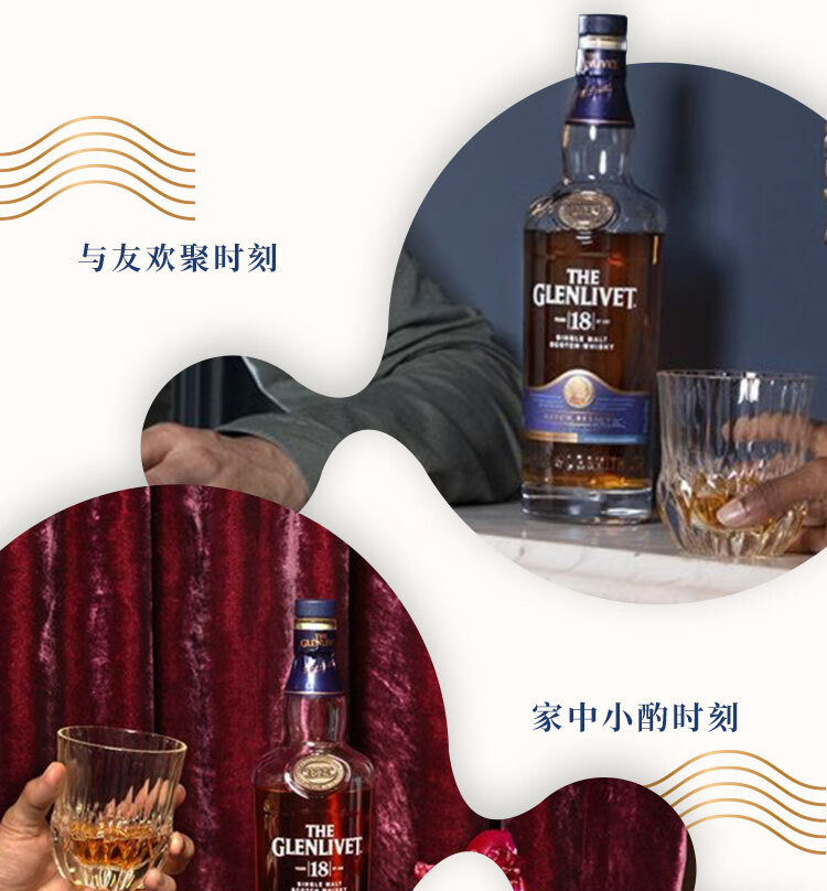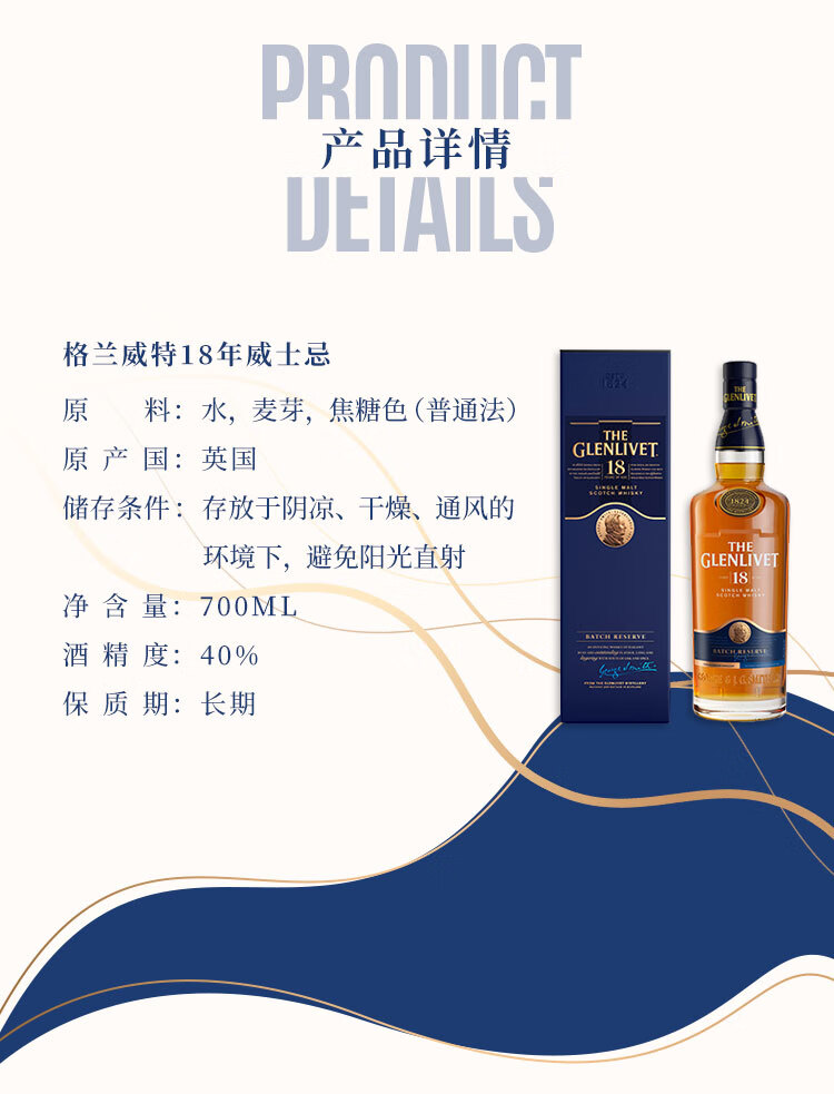 类型:单一麦芽威士忌;产地:苏格兰;适用场景:情侣约会,闺蜜私语,自斟自饮,亲友馈赠,家庭聚会,商务宴请;包装:瓶装;容量:700-999mL;阶段:进阶优选;原料:水、麦芽、焦糖色;保质期:无;酒精度:43%vol;存储方法:通风、干燥、阴凉处。;产品重量:1.72kg;容量:700mL;包装清单:格兰威特(Glenlivet)洋酒 18年 陈酿 单一麦芽威士忌 700ml*1;