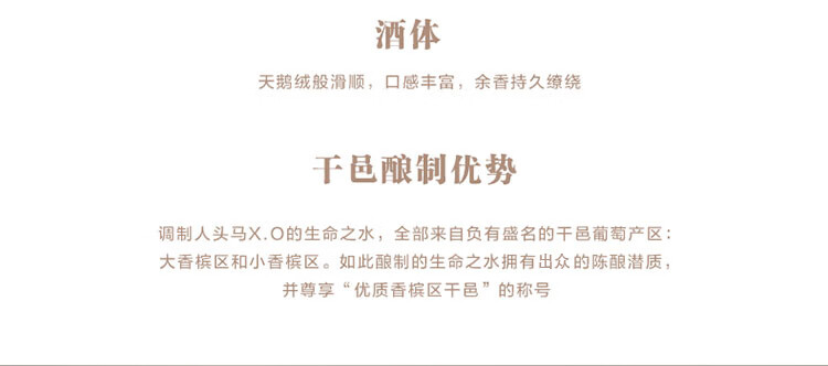 特性:XO;国产/进口:进口;产地:法国;适用场景:家庭聚会,商务宴请,情侣约会,自斟自饮,亲友馈赠,闺蜜私语;包装:瓶装;容量:700-999mL;原料:葡萄,水,焦糖色;产地:法国;特性:XO;保质期:无保质期;酒精度:40%vol;存储方法:常温避光保存;包装:瓶装;容量:700mL;产品重量:1.88kg;包装清单:人头马天醇XO干邑白兰地700ml x1 包装盒 x1;