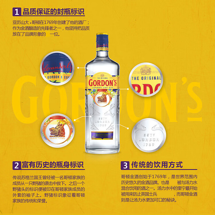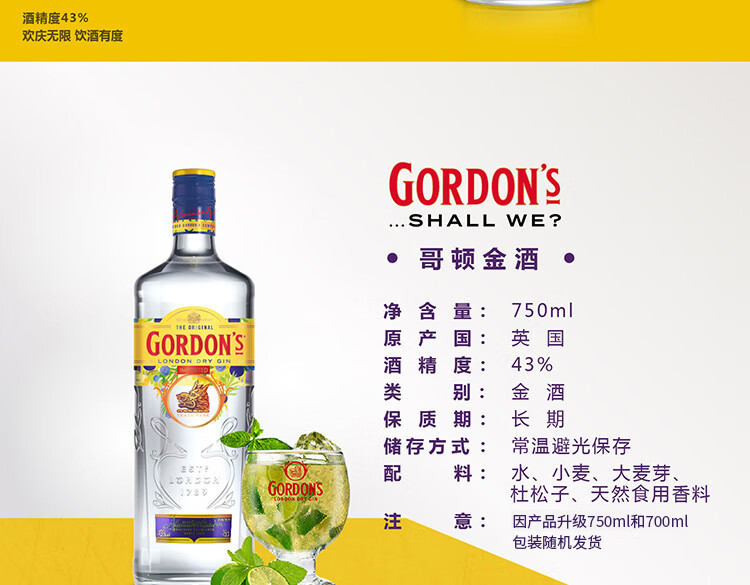 国产/进口:进口;产地:英国;适用场景:情侣约会,自斟自饮,亲友馈赠,闺蜜私语,家庭聚会,商务宴请;包装:瓶装;容量:700-999mL;原料:水、小麦、大麦芽、杜松子、天然使用香料;保质期:长期;酒精度:43%vol;存储方法:干燥、阴凉、通风环境;容量:700mL;产品重量:1.15kg;包装清单:哥顿金酒干味伦敦金酒700ml X 1;