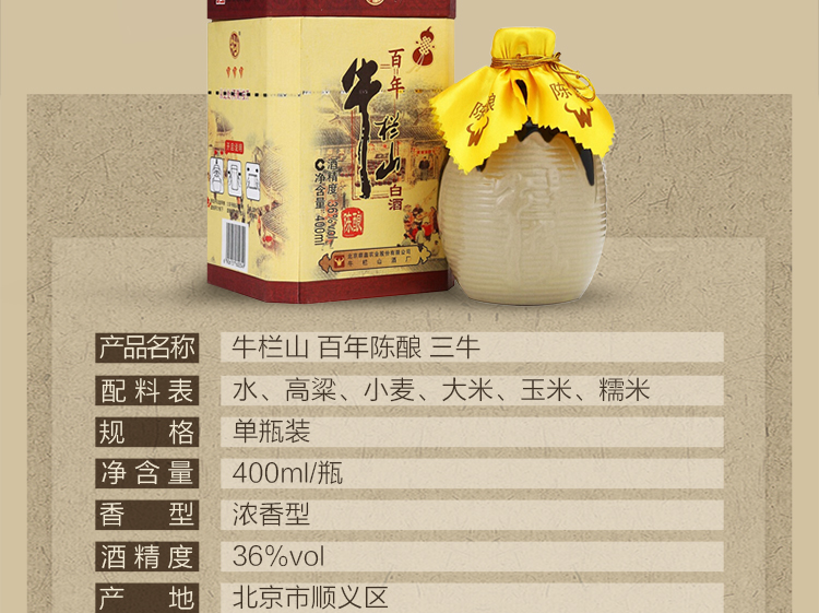 包装:瓶装;容量:376-499mL;香型:浓香型;度数:35-39度;香型:浓香型;产地:北京;度数:36;包装:瓶装;产品重量(kg):1.02;容量:400ml;包装清单:牛栏山 百年陈酿 三牛 36度 400ml 单瓶装 浓香型白酒*1;