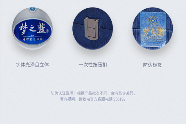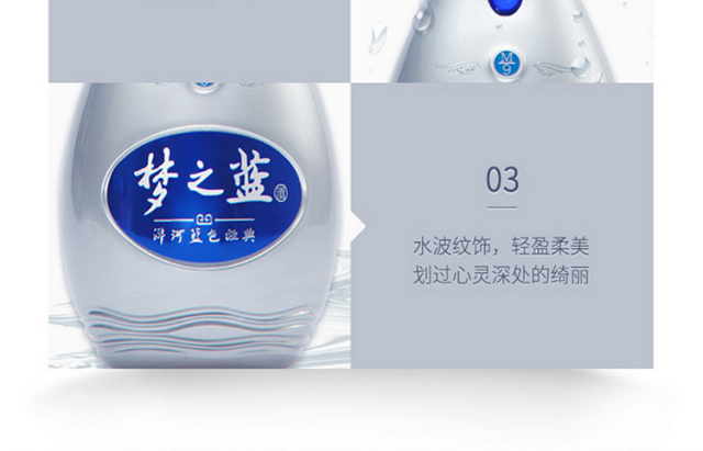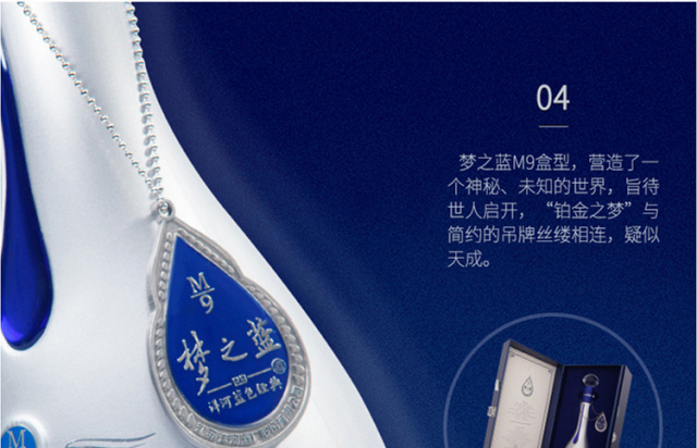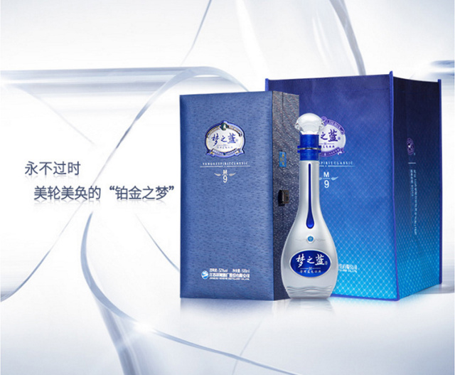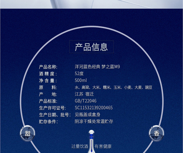 包装:瓶装;容量:500-749mL;香型:浓香型;度数:50度及以上;香型:浓香型;产地:江苏;酒精度:52%vol;包装:瓶装;产品重量:2110g;容量:500ml;包装清单:梦之蓝M9 52度 单瓶装白酒500ml*1;