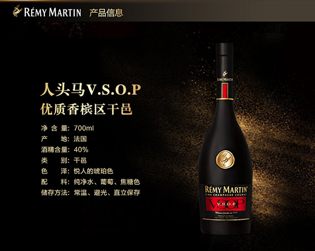 特性:VSOP;国产/进口:进口;产地:法国;适用场景:家庭聚会,商务宴请,情侣约会,自斟自饮,亲友馈赠,闺蜜私语;包装:瓶装;容量:700-999mL;酒精度:40;原料:葡萄、水、焦糖色;保质期:无保质期;产地:法国;特性:VSOP;存储方法:常温避光保存;容量:700ml;包装:单瓶;产品重量(kg):1.4;包装清单:人头马VSOP特优干邑白兰地700mlx1 人头马VSOP特优干邑白兰地包装盒x1;