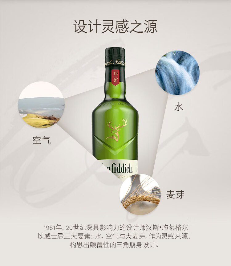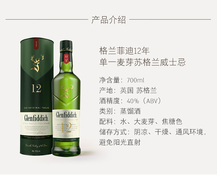 类型:单一麦芽威士忌;产地:苏格兰;适用场景:自斟自饮,亲友馈赠,家庭聚会,商务宴请;包装:瓶装;容量:700-999mL;阶段:小白入门;原料:水、大麦芽;保质期:无;酒精度:40%vol;存储方法:常温避光保存;产品重量:1.5kg;容量:700mL;包装清单:格兰菲迪(Glenfiddich)12年苏格兰达夫镇单一麦芽威士忌700ml *1;
