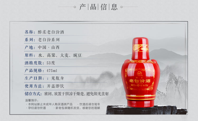 包装:整箱装;容量:750mL及以上;香型:清香型;产地:山西;度数:50度及以上;酒精度:53%vol;容量:475;产品重量:8700g;包装清单:汾酒 醇柔老白汾 53度 475ml*6 整箱装;