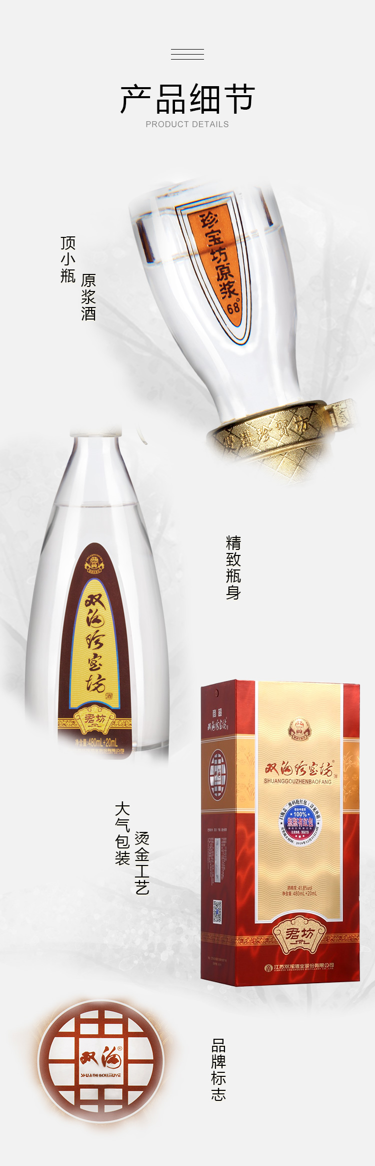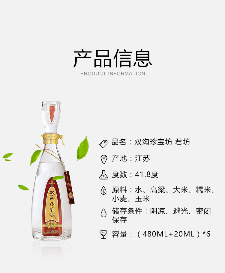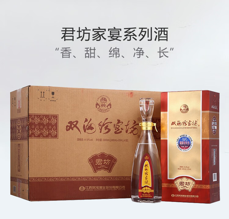 包装:整箱装;容量:750mL及以上;香型:浓香型;产地:江苏;度数:40-49度;酒精度:41.8%vol;容量:500ml;产品重量:9960g;包装清单:双沟珍宝坊之君坊 41.8度500ml×6、礼品袋×3;