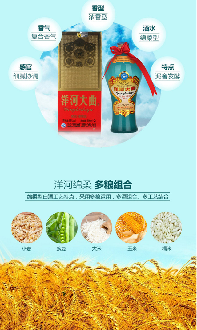 包装:整箱装;容量:500-749mL;香型:浓香型;产地:江苏;度数:50度及以上;酒精度:55%vol;容量:500ml;产品重量:6310g;包装清单:洋河大曲55度 500ml×6;