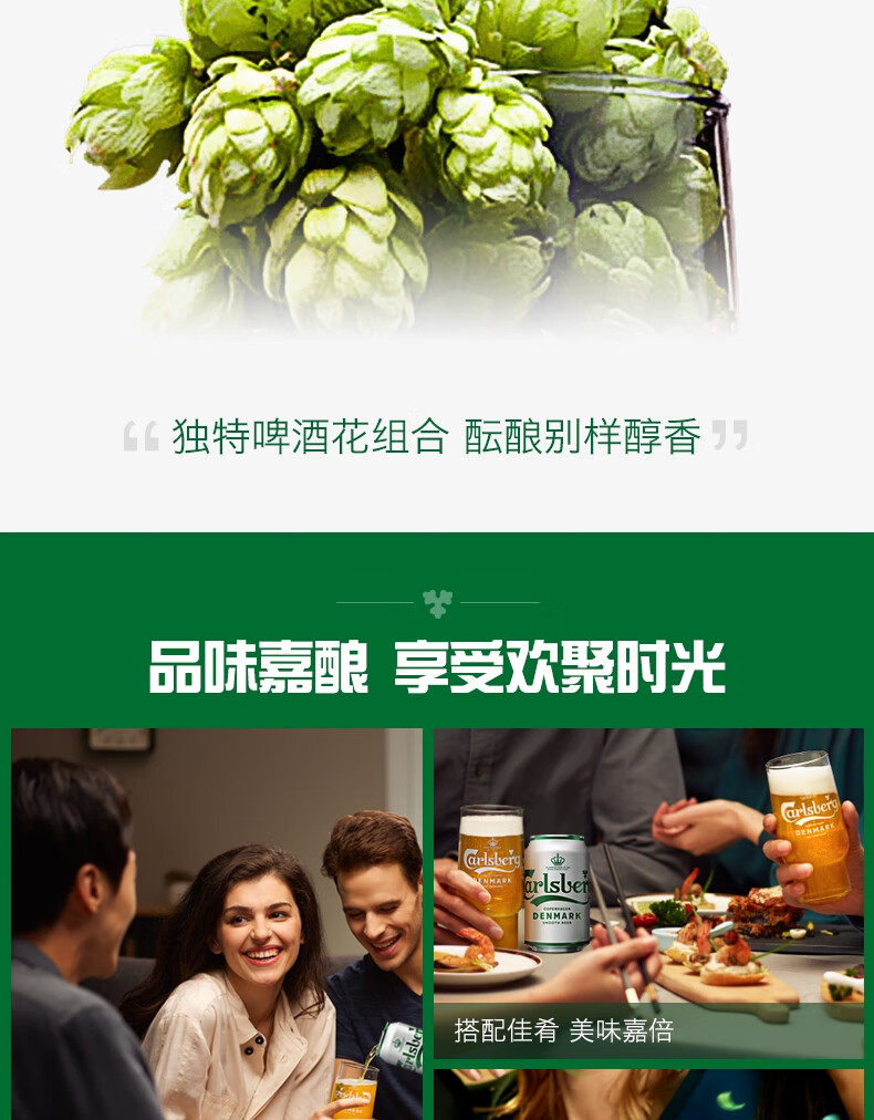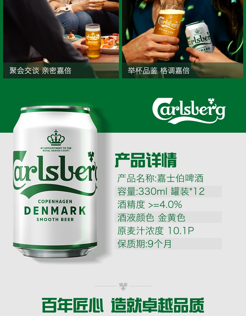 国产/进口:国产;产地:中国大陆;适用场景:家庭聚会,礼节拜访,情侣约会,自斟自饮,派对必备,烧烤撸串,酒吧夜店;包装:听装;容量:330mL;类别:黄啤酒;原料:水、麦芽、大米、酒花;国产/进口:国产;保质期:9个月;酒精度:4.0;原产地:中国大陆;原麦汁浓度:10.1;存储方法:阴凉避光存储;类别:黄啤酒;包装:听装;产品重量:8.55kg;容量:330;包装清单:嘉士伯啤酒330ml*24听 × 1;