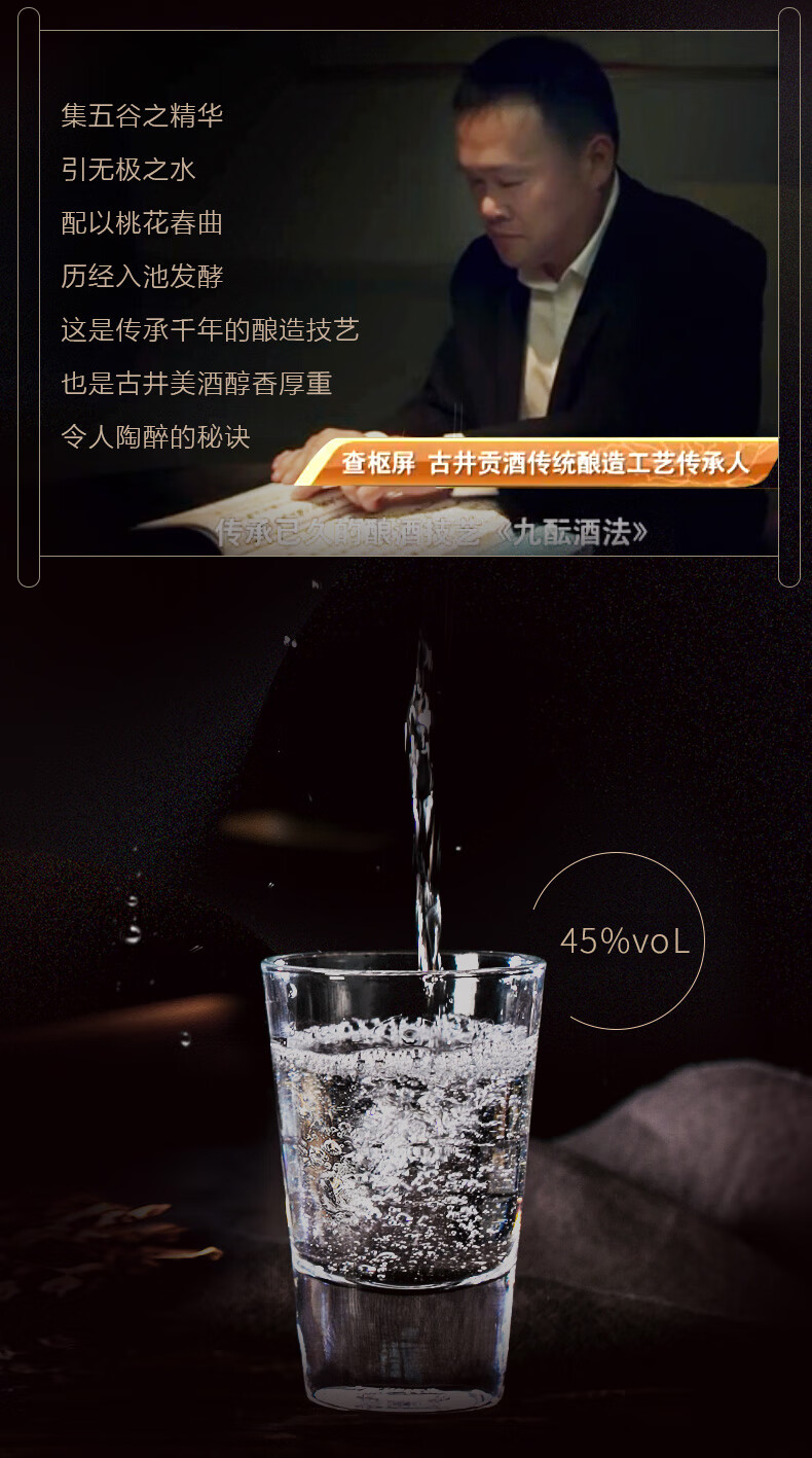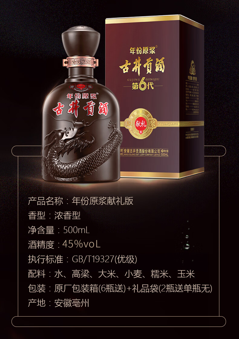 包装:瓶装;容量:376-499mL;香型:浓香型;产地:安徽;度数:40-49度;酒精度:45%vol;容量:500;产品重量:1250g;包装清单:古井贡酒年份原浆献礼版45度 500ml × 1;