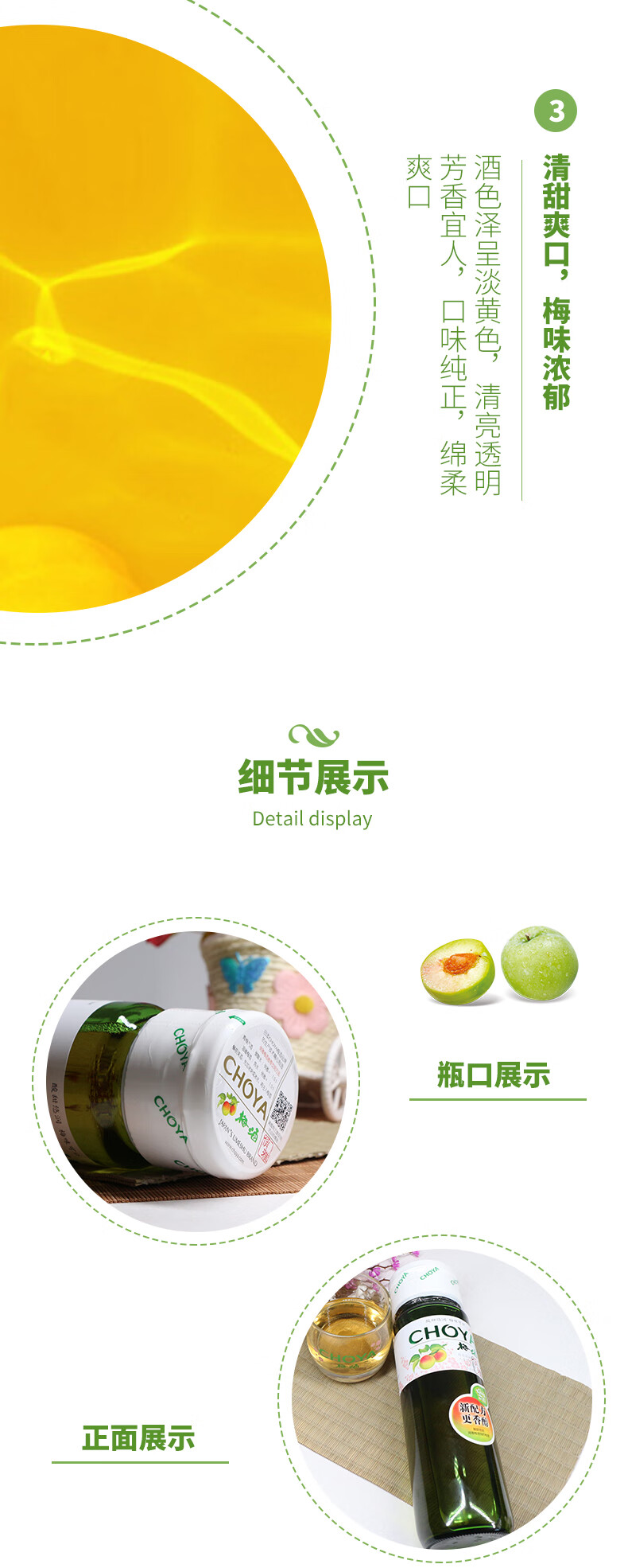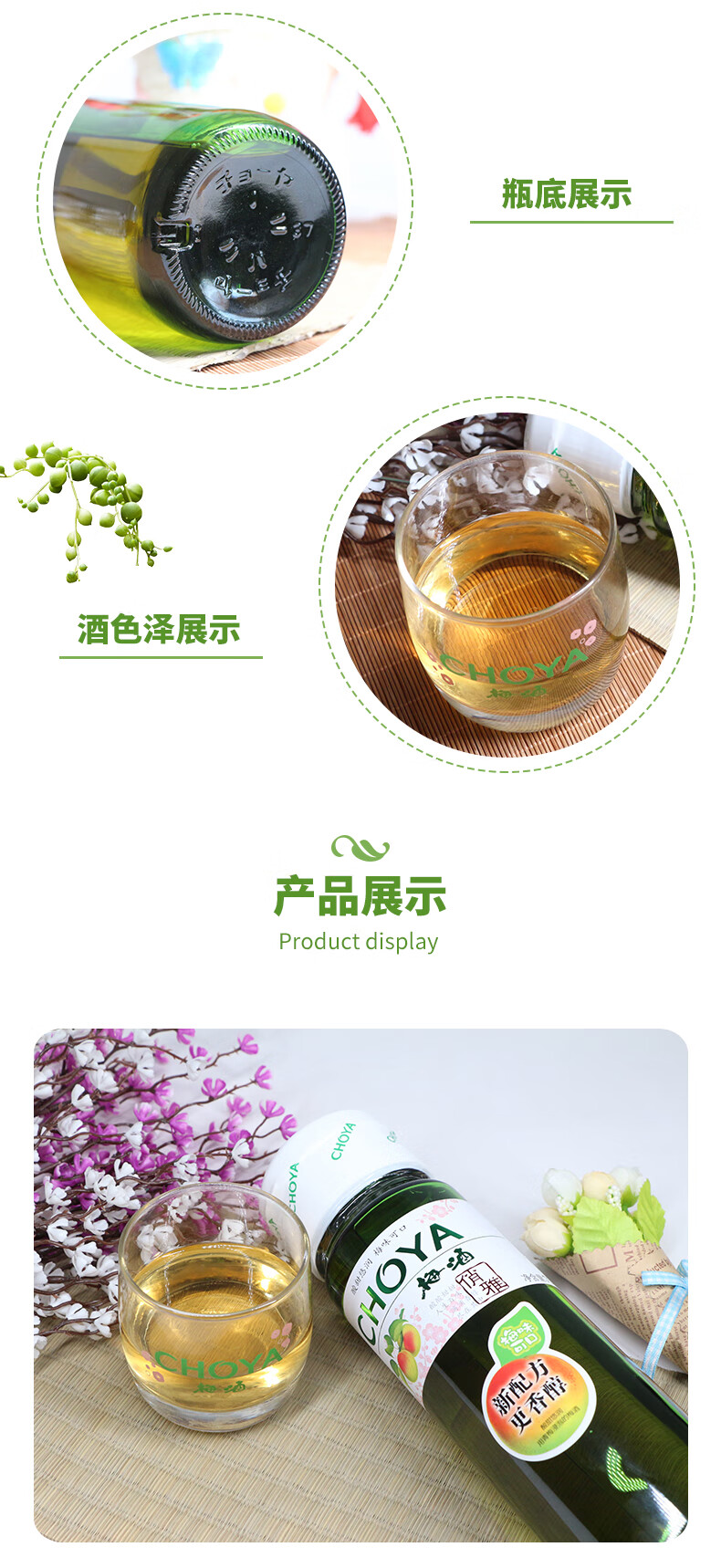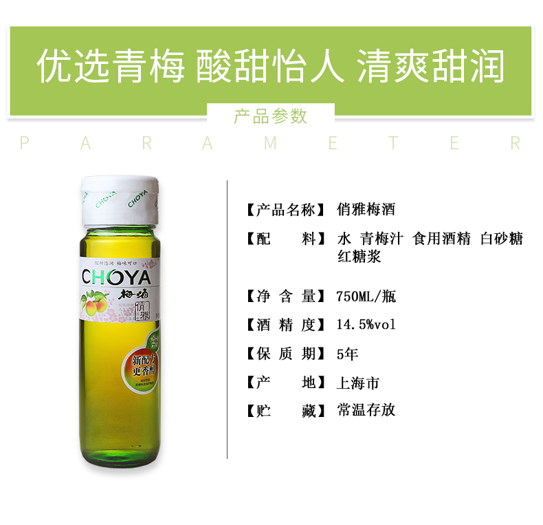 水果分类:青梅;适用场景:家庭聚会,情侣约会,闺蜜私语;包装:瓶装;容量:700mL-999mL;国产/进口:国产;产地:其它;原料:水、白砂糖、青梅、食用酒精、青梅汁;保质期:5年;酒精度:14.5%vol;存储方法:请放置于阴凉干燥处;产品重量:1.48kg;包装清单:Choya俏雅梅酒750ml × 1;