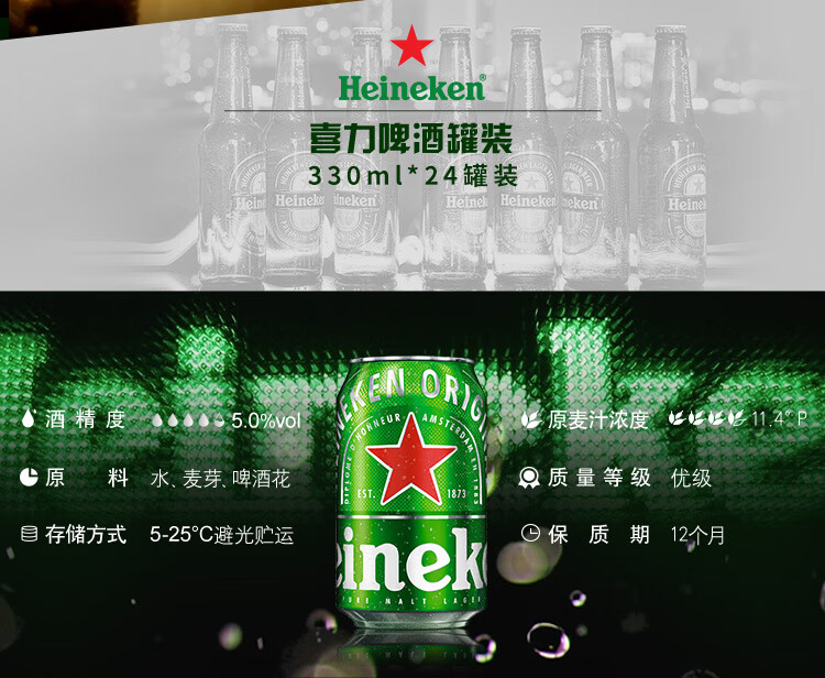 国产/进口:国产;产地:中国大陆;适用场景:礼节拜访,家庭聚会,自斟自饮,情侣约会,烧烤撸串,派对必备,酒吧夜店;包装:听装;容量:330mL;类别:黄啤酒;原料:水、麦芽、啤酒花;保质期:12个月;酒精度:5.0%vol;原产地:中国大陆;原麦汁浓度:11.4°P;存储方法:5°-25°避光贮运;容量:330ml;产品重量:8.60kg;包装清单:喜力啤酒330ml*24;