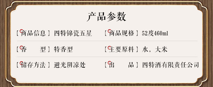 包装:瓶装;容量:376-499mL;香型:特香型;产地:江西;度数:50度及以上;酒精度:52%vol;容量:460ml;产品重量:1.40g;包装清单:四特锦瓷五星52度460ml*1;