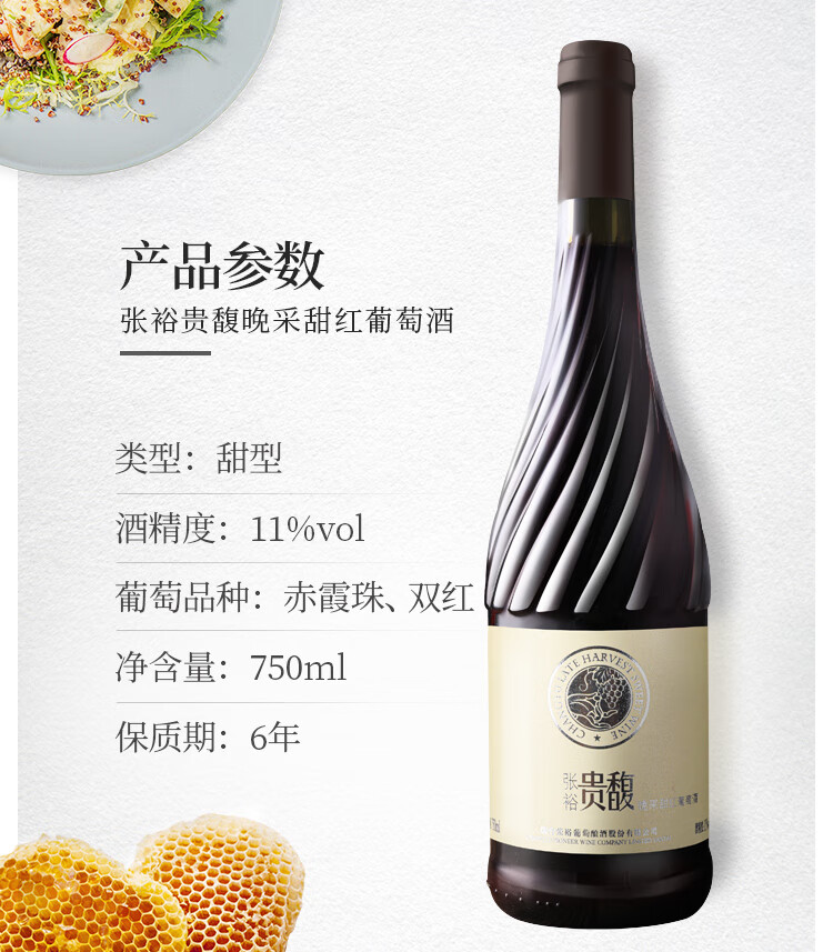 颜色:宝石红;口感:柔和;特性:普通餐酒;国产/进口:国产;适用场景:礼节拜访,商务宴请,婚礼婚宴,情侣约会,家庭聚会,自斟自饮,闺蜜私语,派对活动;包装:瓶装;类别:红葡萄酒;葡萄品种:其它;类型:静止酒;香型:花香,植物,果香;产地:中国大陆;容量:750mL;甜度:甜型;保质期:6年;酒精度:11%vol;原产地:中国大陆;存储方法:避免阳光直射,于5℃~25℃干燥通风处卧放或倒放,有少量沉淀不影响饮用;容量:750ml;产品重量:0kg;包装清单:葡萄酒750ml × 1;