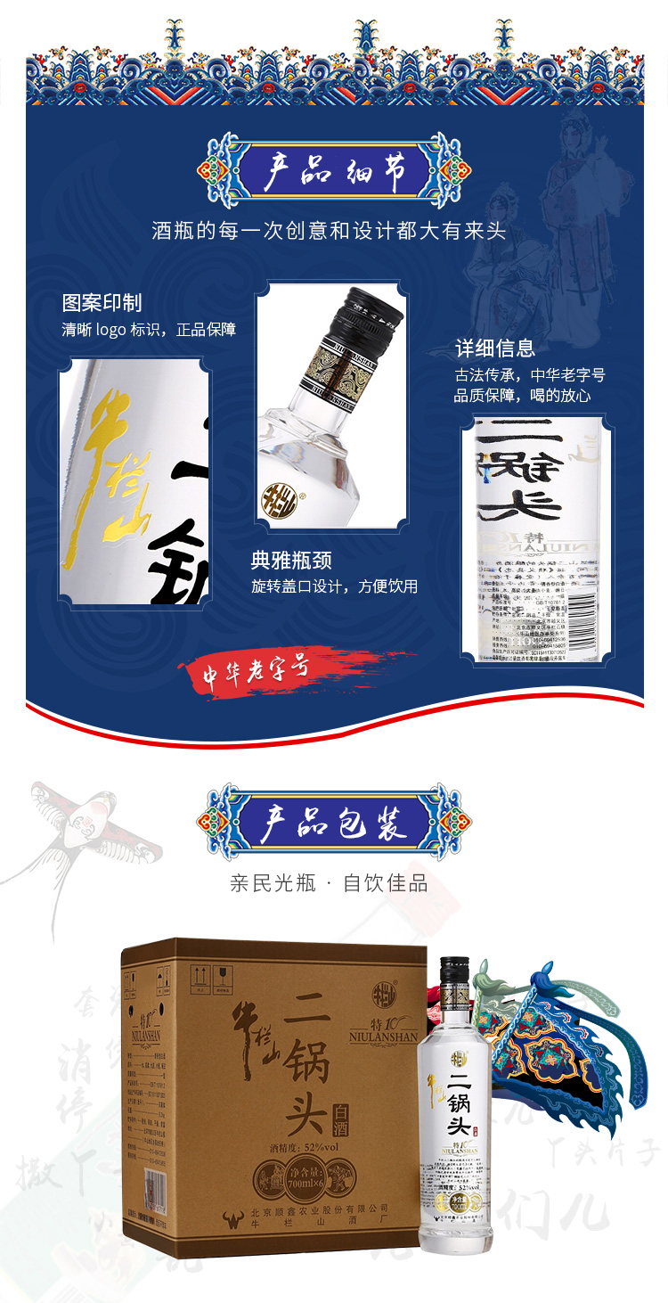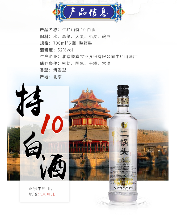 包装:整箱装;容量:500-749mL;香型:清香型;度数:50度及以上;香型:清香型;产地:北京;酒精度:52%vol;包装:整箱装;容量:700ml*6;产品重量:8180g;包装清单:牛栏山 特制10 二锅头 52度 700ml*6瓶 整箱装 清香型白酒*1;