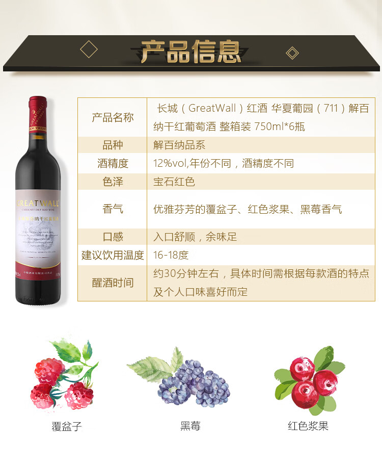颜色:宝石红;口感:饱满;特性:其它;国产/进口:国产;适用场景:家庭聚会,礼节拜访,商务宴请,婚礼婚宴,情侣约会,自斟自饮,闺蜜私语,派对活动;包装:整箱装;酸度:中酸;类别:红葡萄酒;葡萄品种:其它;类型:静止酒;香型:果香;产地:中国大陆;容量:750mL;甜度:干型;系列:华夏葡园;保质期:3650天;酒精度:12%vol;原产地:中国大陆;存储方法:避免阳光直射,于5℃~25℃干燥通风处卧放或倒放为宜。;容量:750ml;产品重量:7.97kg;包装清单:华夏长城(711)解百纳干红葡萄酒 整箱装 750ml*6瓶;