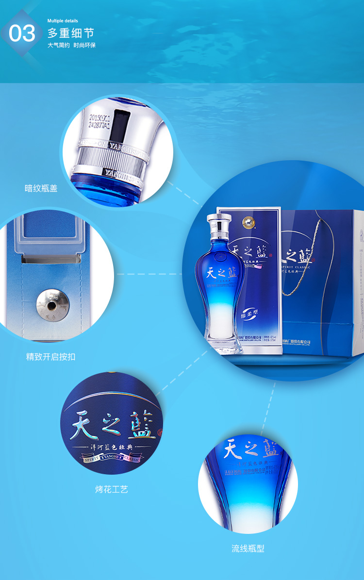 包装:瓶装;容量:376-499mL;香型:浓香型;度数:40-49度;香型:浓香型;产地:江苏;包装:整箱装;产品重量:0g;包装清单:洋河蓝色经典天之蓝42度 480ml×1;