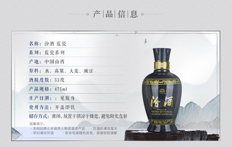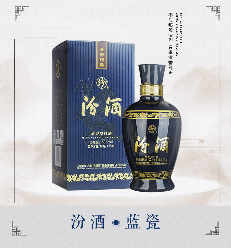包装:瓶装;容量:376-499mL;香型:清香型;产地:山西;度数:50度及以上;酒精度:53%vol;容量:475;产品重量:1040g;包装清单:汾酒 蓝瓷系列 475ml 53度 单瓶;