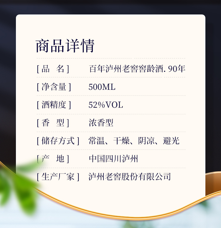 包装:瓶装;容量:376-499mL;香型:浓香型;产地:四川;度数:50度及以上;酒精度:52%vol;容量:500ml;产品重量:1800g;包装清单:白酒 × 1;