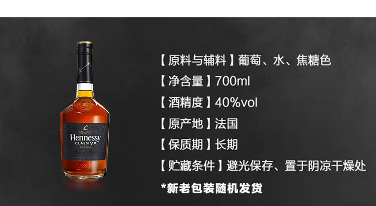 特性:其它;国产/进口:进口;产地:法国;适用场景:家庭聚会,商务宴请,情侣约会,自斟自饮,亲友馈赠,闺蜜私语;包装:瓶装;容量:700-999mL;原料:葡萄、水、焦糖色;保质期:长期;酒精度:40%vol;存储方法:恒温避光;产品重量:1.32kg;容量:700mL;包装清单:干邑白兰地 700ml x1;