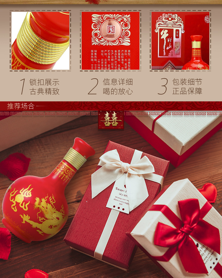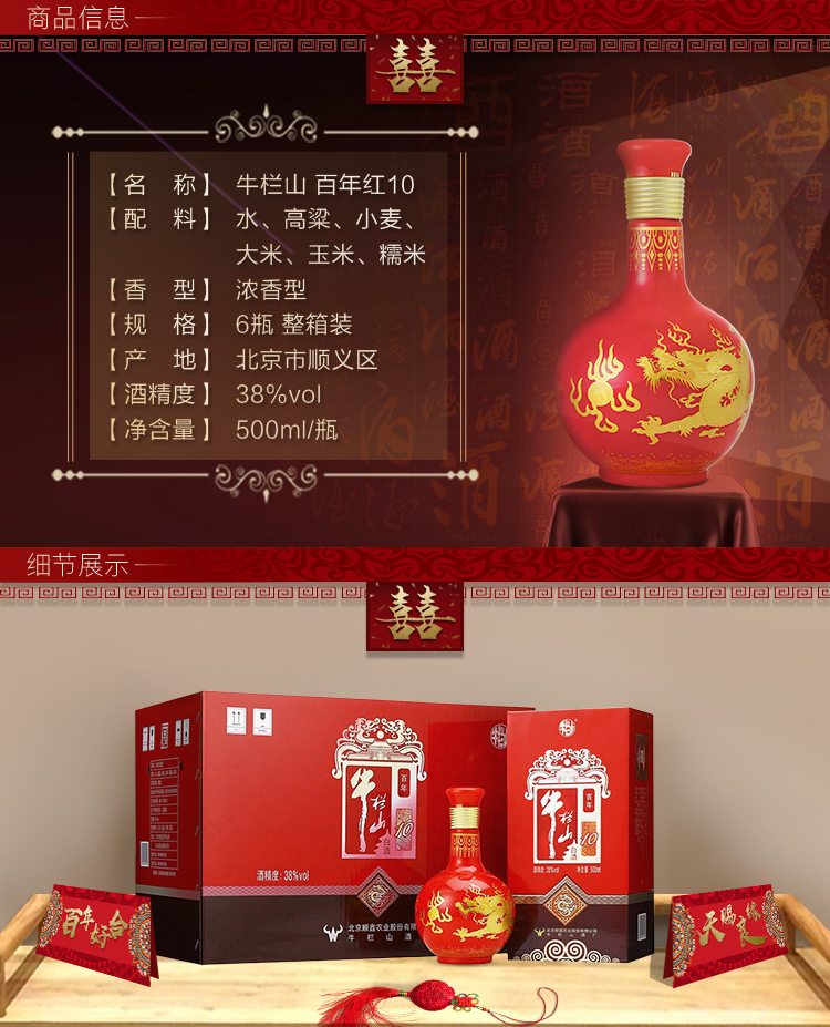 包装:整箱装;容量:376-499mL;香型:浓香型;产地:北京;度数:35-39度;酒精度:38%vol;容量:500ml;产品重量:86500g;包装清单:牛栏山 百年红10 38度 500ml*6瓶 整箱装 浓香型白酒(内含三个礼品袋)*1;