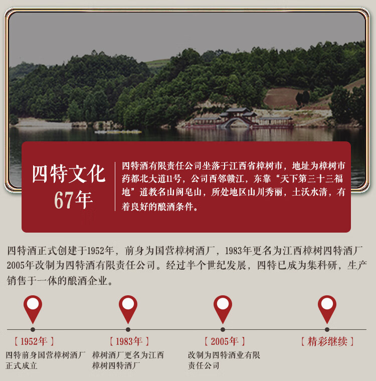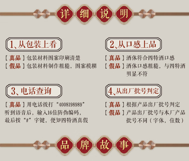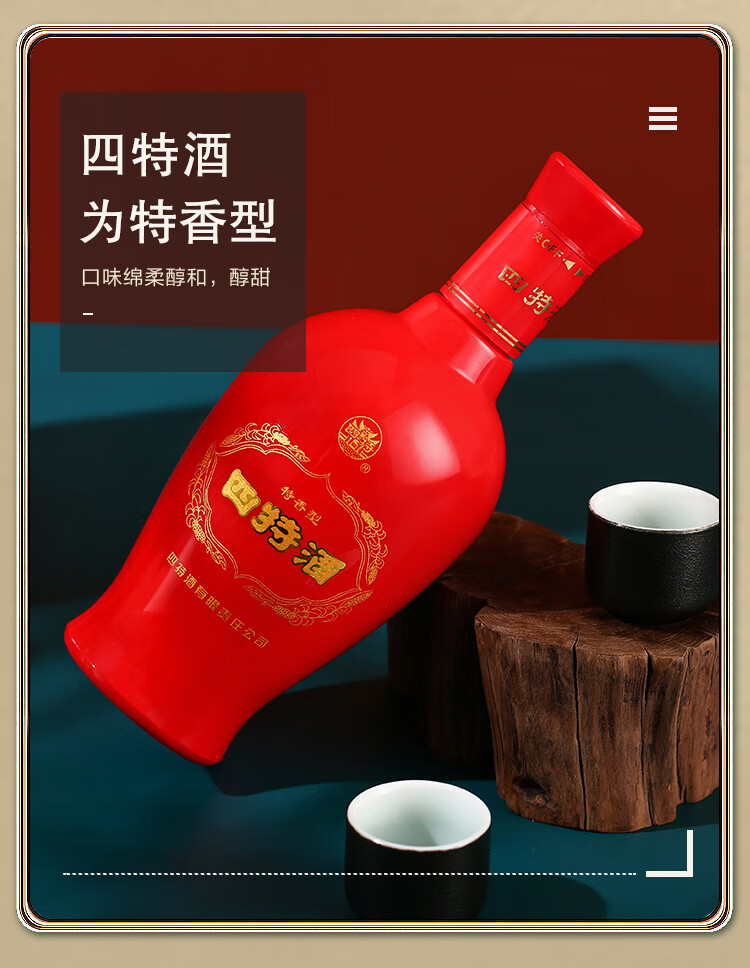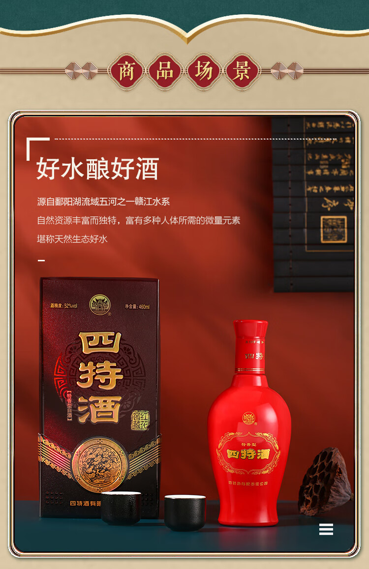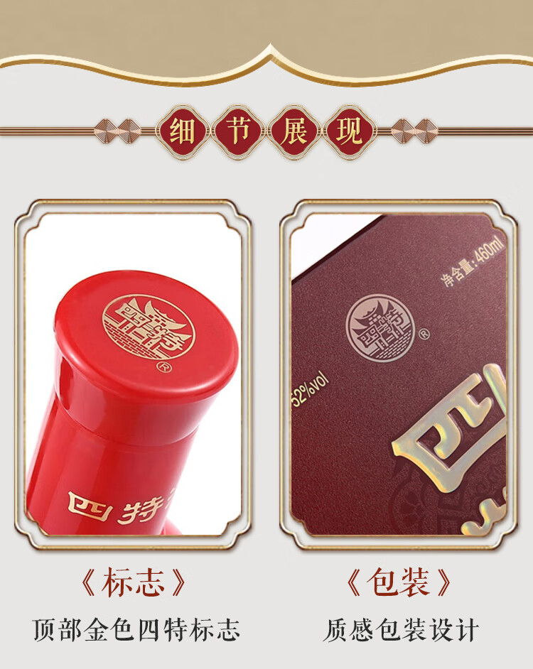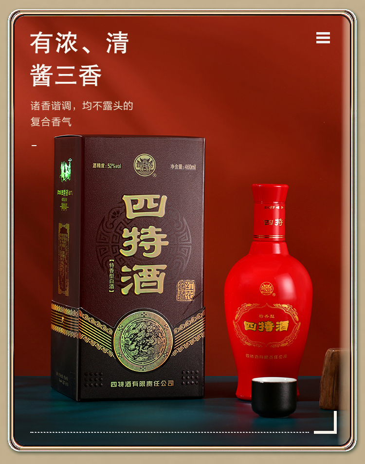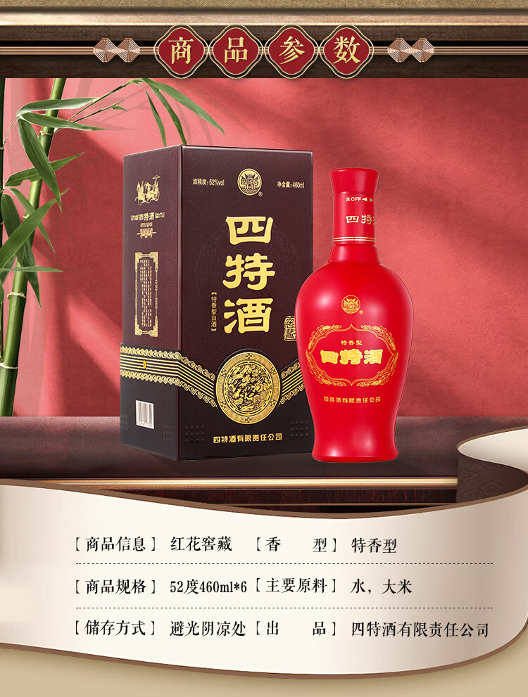 包装:整箱装;容量:376-499mL;香型:特香型;产地:江西;度数:50度及以上;酒精度:52%vol;容量:460ml;产品重量:7.38g;包装清单:四特红花窖藏52度整箱装460ml*6瓶;