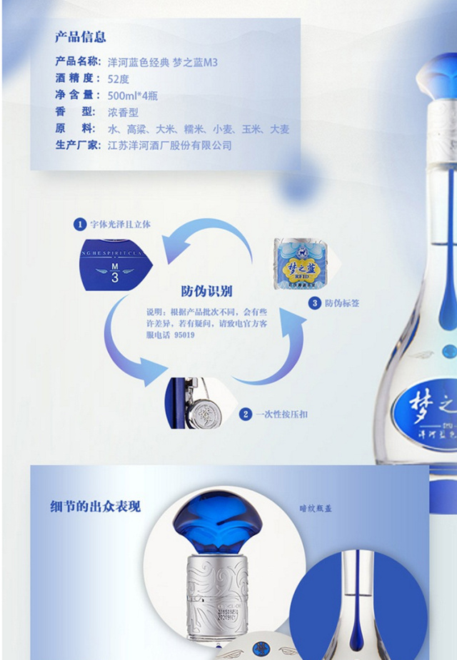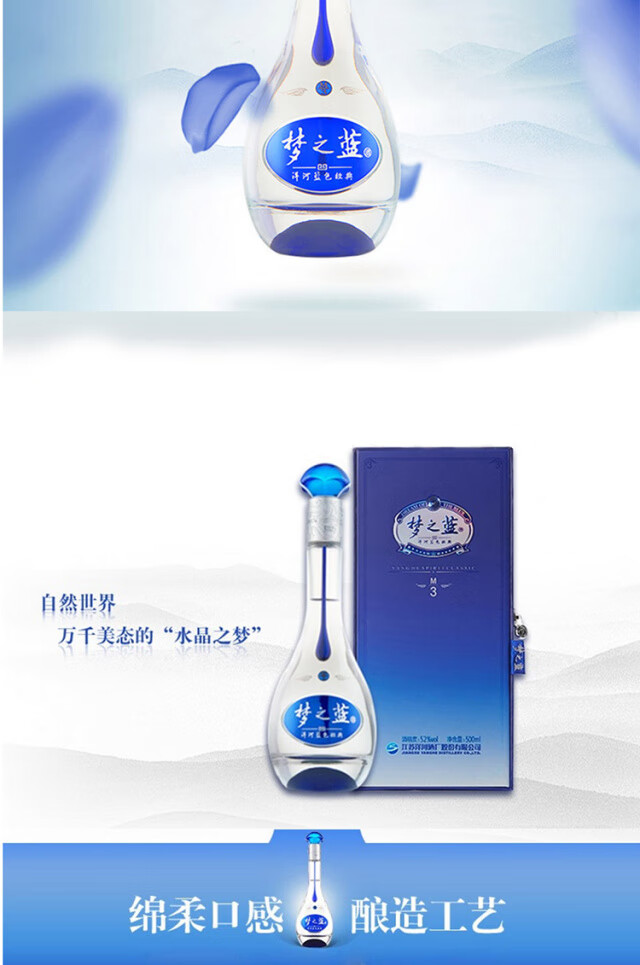 包装:整箱装;容量:500-749mL;香型:浓香型;度数:50度及以上;香型:浓香型;产地:江苏;酒精度:52%vol;包装:整箱装;产品重量:9395g;容量:500;包装清单:洋河52度梦之蓝M3整箱装500ml*4瓶 礼品袋*2;