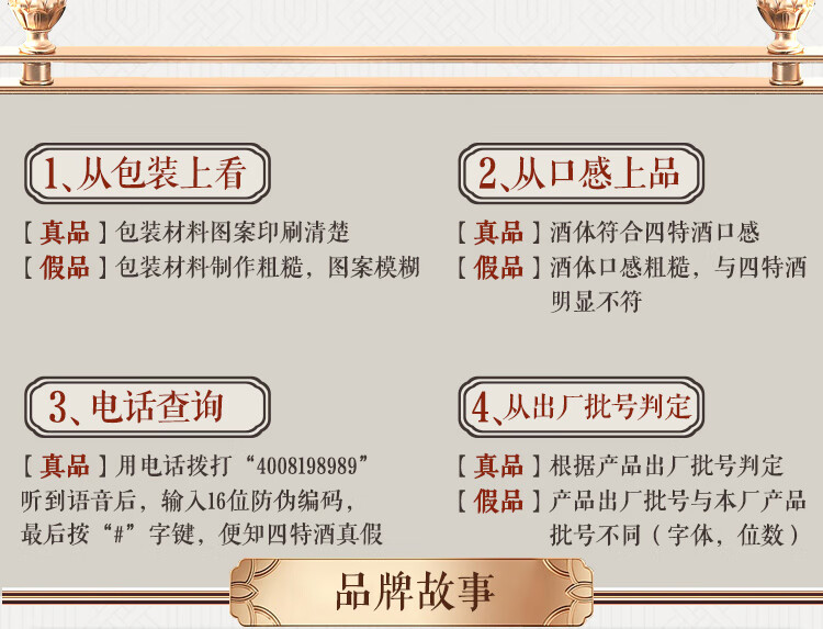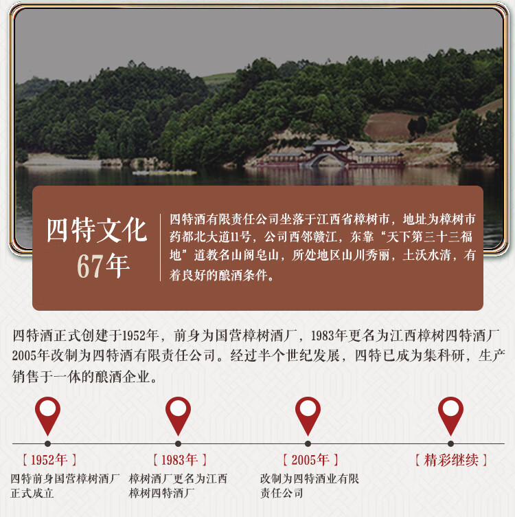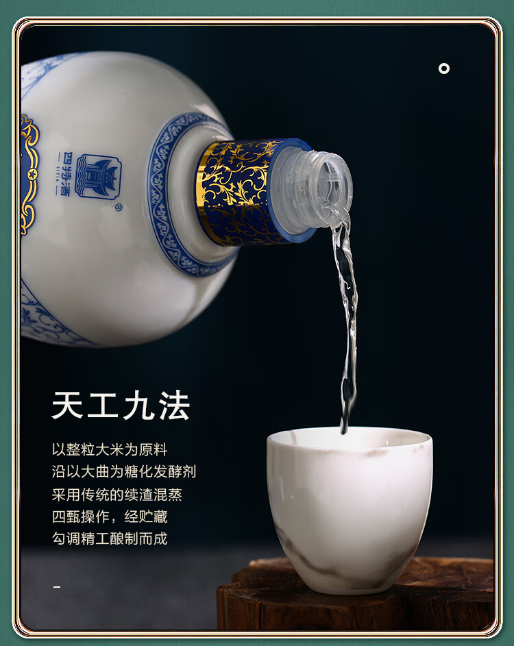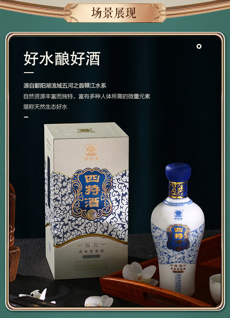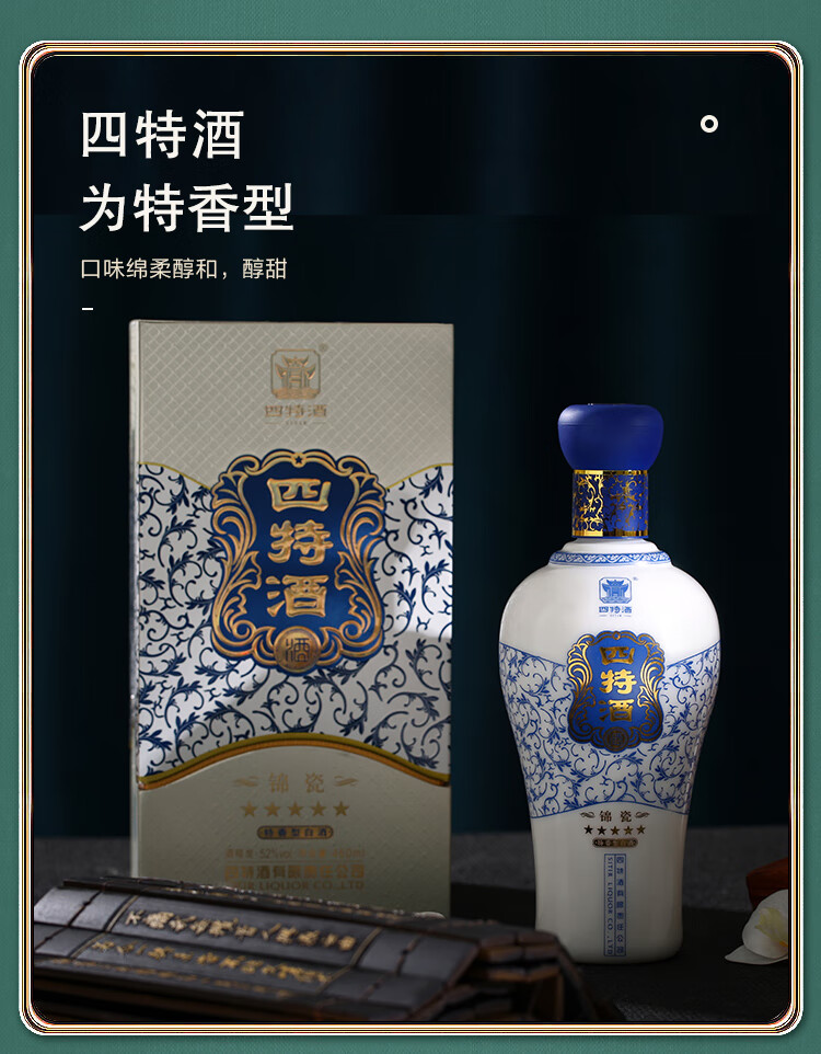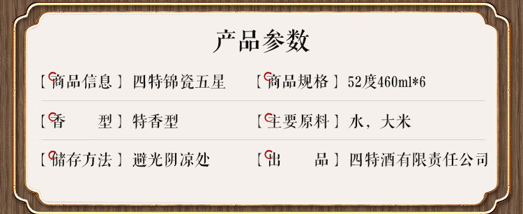 包装:整箱装;容量:376-499mL;香型:特香型;产地:江西;度数:50度及以上;酒精度:52%vol;容量:460ml;产品重量:9.1g;包装清单:四特锦瓷五星52度整箱装460ml*6瓶;