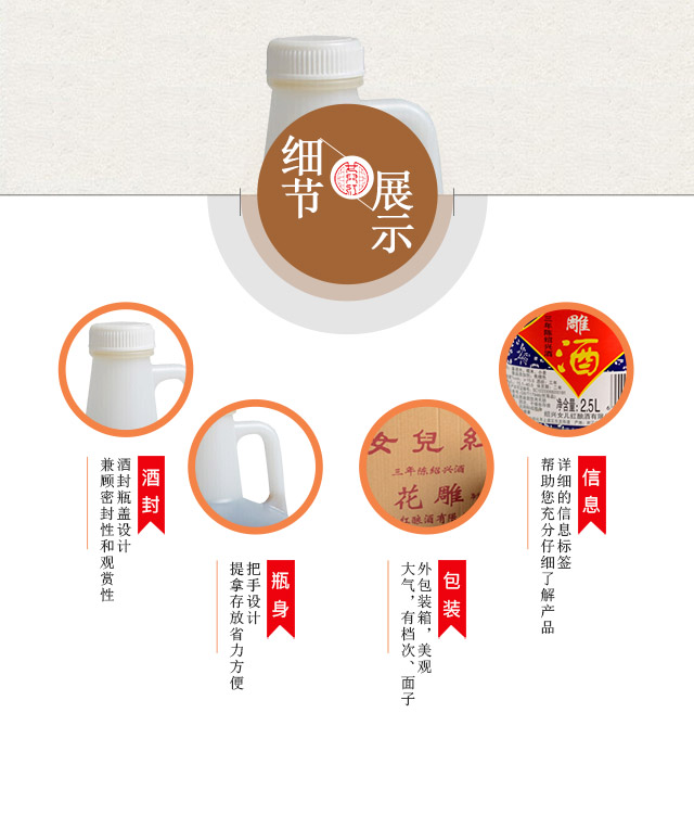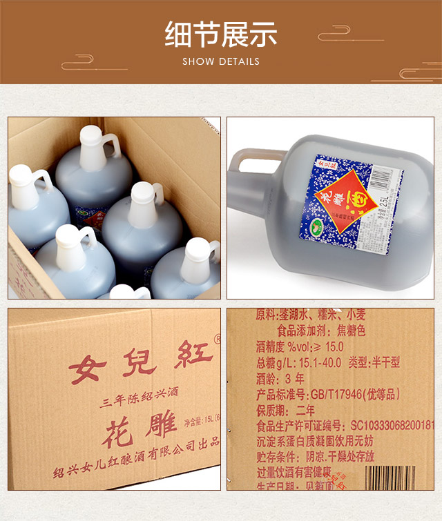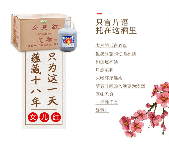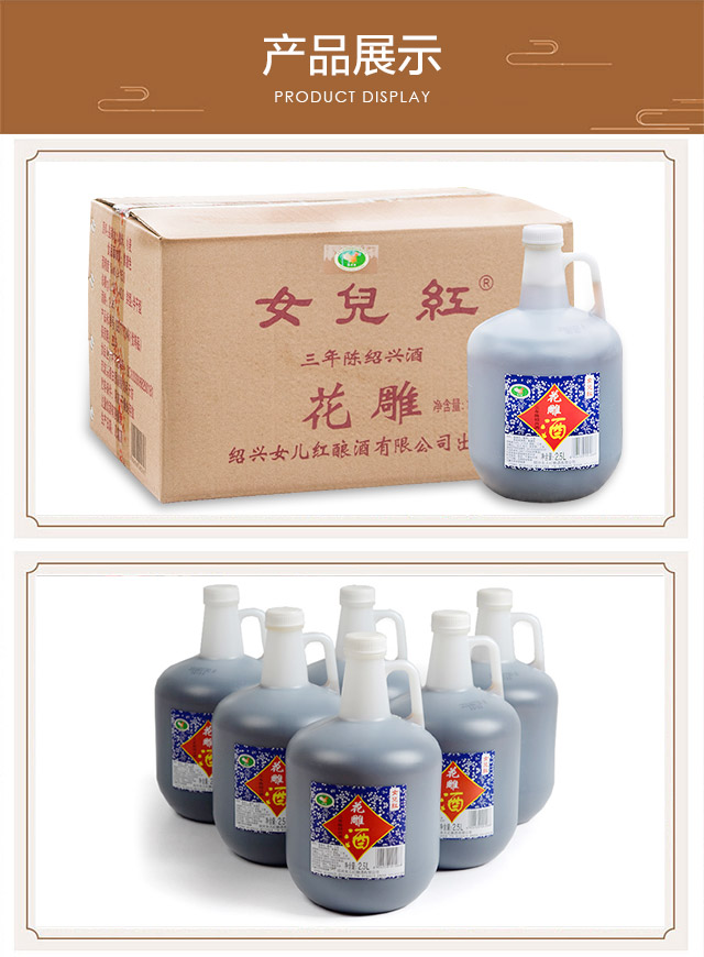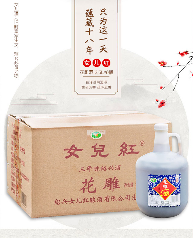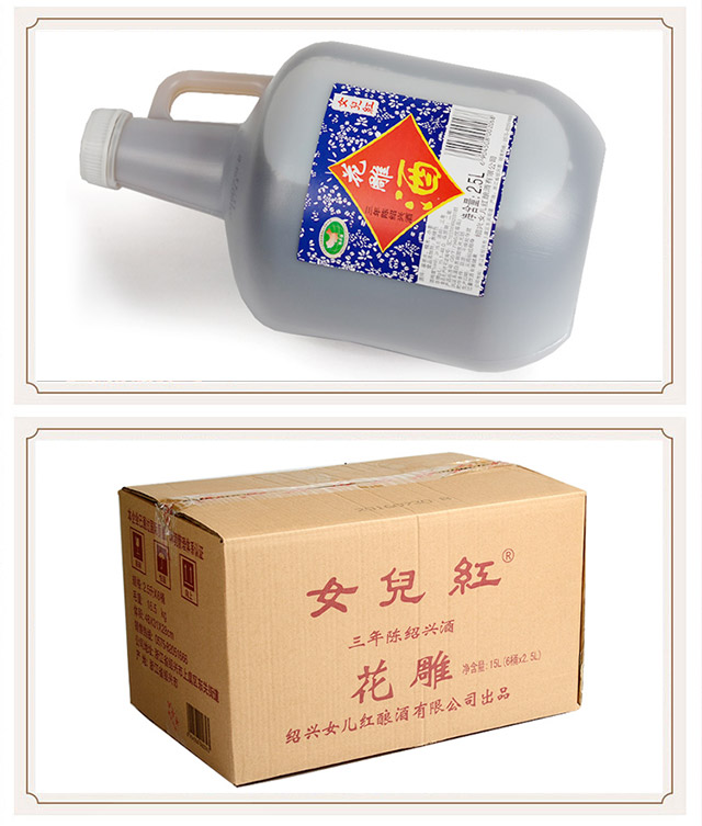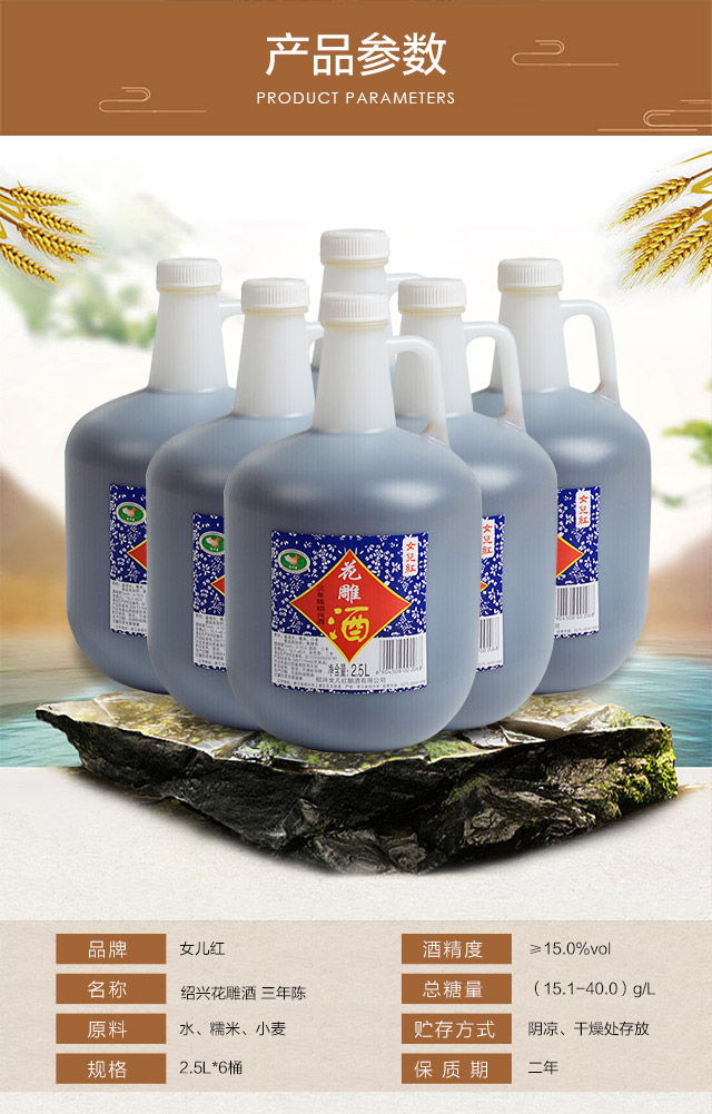 口味:半干型黄酒(总糖:15.0-40.0g/L);度数:10-19度;产地:其它;适用场景:商务宴请,礼节拜访,家庭聚会,朋友小聚,自斟自饮;包装:整箱装;容量:1-5L;保质期:30个月;酒精度:15%vol;存储方法:阴凉干燥;容量:2500mL;产品重量:16.6kg;包装清单:女儿红三年陈绍兴酒2.5L*6桶 *1;