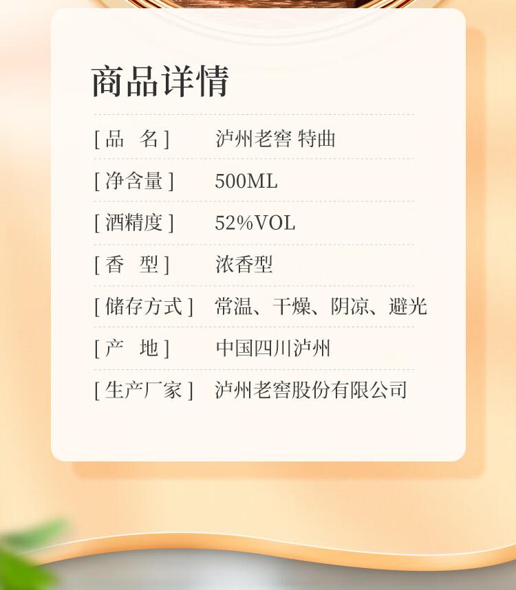 包装:瓶装;容量:500-749mL;香型:浓香型;产地:四川;度数:50度及以上;酒精度:52%vol;容量:500ml;产品重量:1500g;包装清单:泸州老窖特曲*1;