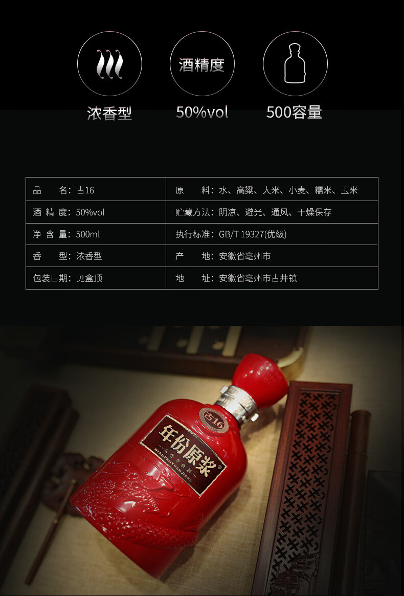 包装:整箱装;容量:500-749mL;香型:浓香型;产地:其它;度数:50度及以上;酒精度:50%vol;容量:500;产品重量:1107g;包装清单:古井贡酒十六年份年原浆50度整箱装500ml*6瓶 礼品袋*3;