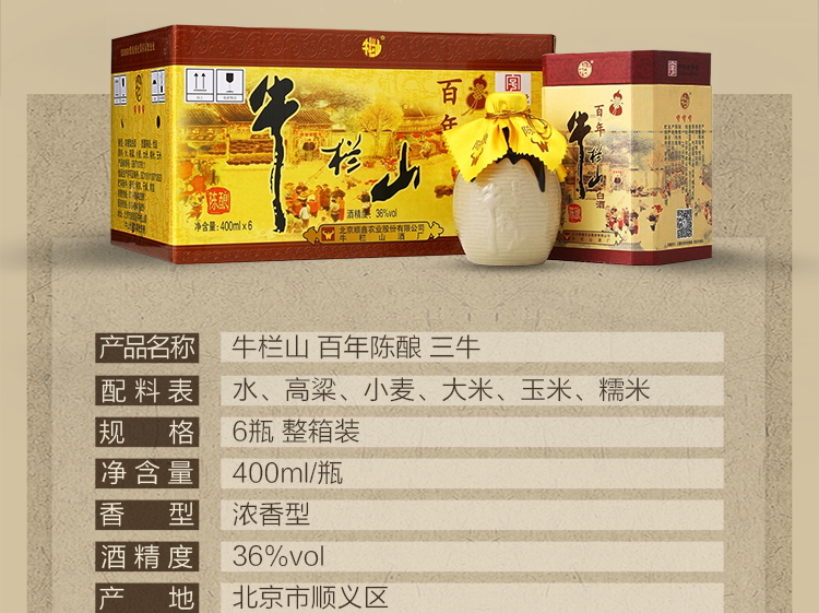 包装:整箱装;容量:376-499mL;香型:浓香型;产地:北京;度数:35-39度;酒精度:36%vol;容量:400ml*6;产品重量:6.74g;包装清单:牛栏山 百年陈酿 三牛 36度 400ml*6瓶 整箱装 浓香型白酒(内含三个礼品袋)*1;