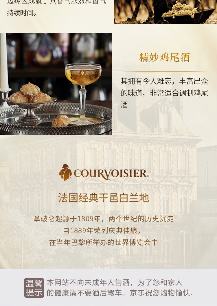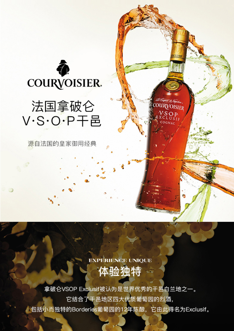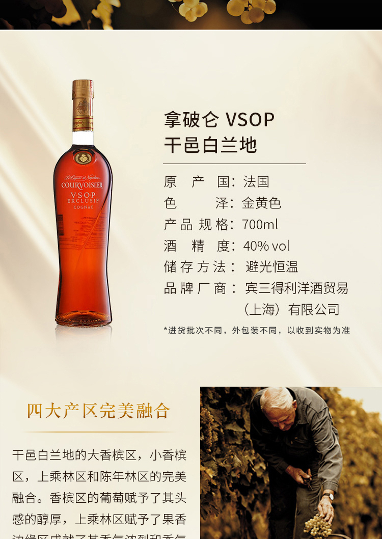适用场景:自斟自饮;包装:瓶装;容量:700-999mL;特性:VSOP;国产/进口:进口;产地:法国;原料:水、葡萄汁;保质期:长期保存;酒精度:40%vol;存储方法:常温避光保存;容量:700mL;产品重量:1.43kg;包装清单:拿破仑(Courvoisier) 洋酒 法国拿破仑干邑 VSOP干邑白兰地700ML*1;