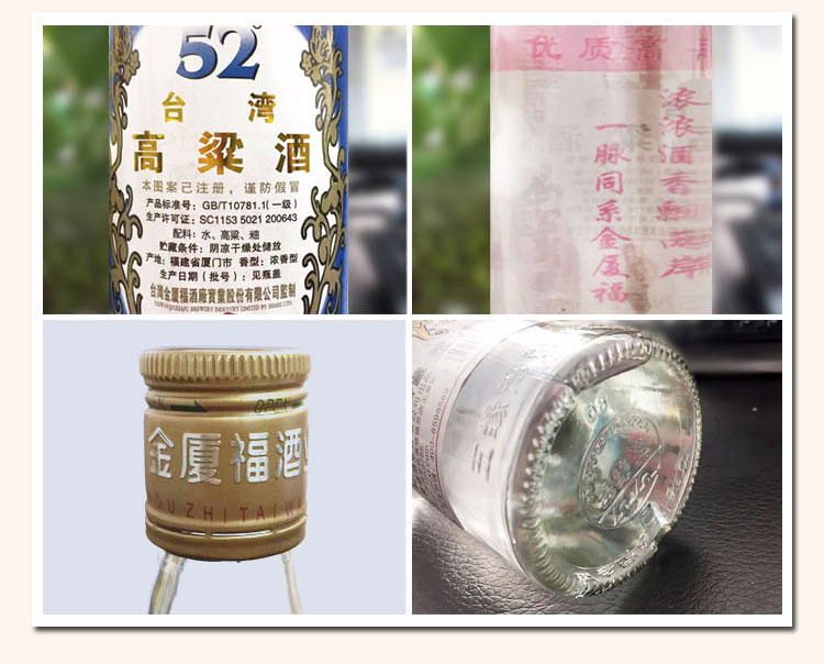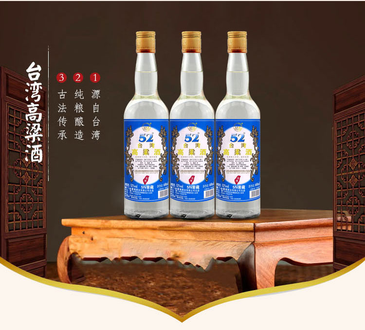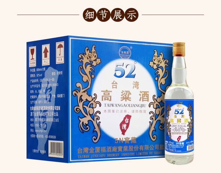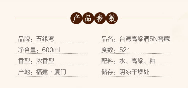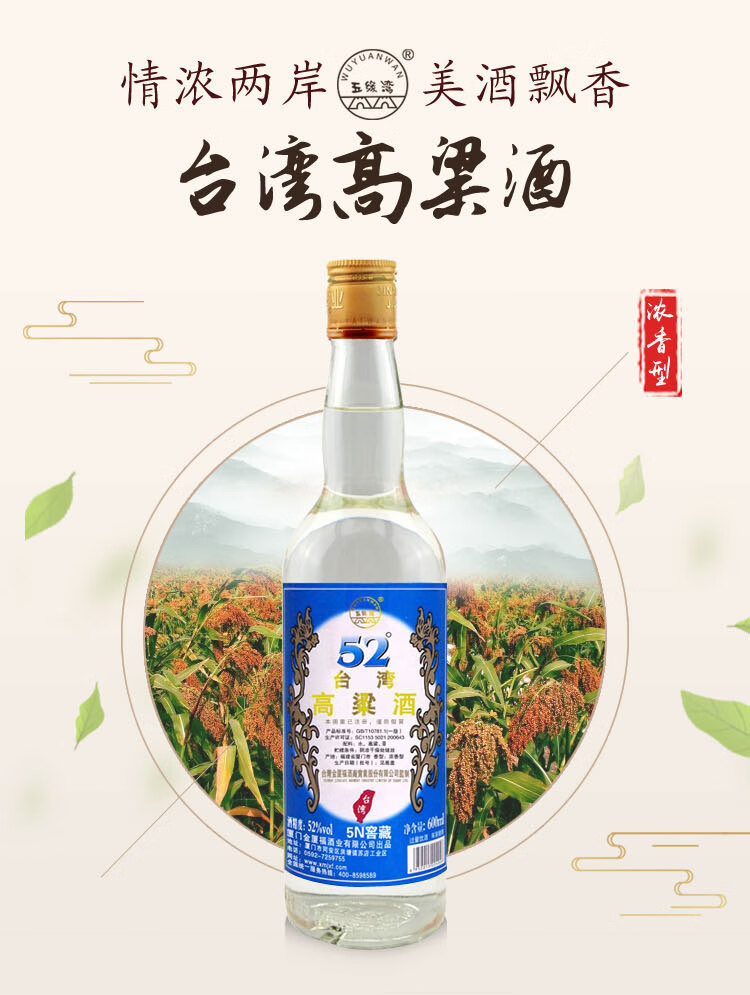 包装:整箱装;容量:500-749mL;香型:浓香型;度数:50度及以上;香型:浓香型;产地:福建;酒精度:52%vol;包装:整箱装;产品重量:1273g;容量:7200ml;包装清单:五缘湾 台湾高粱酒五年窖藏整箱装 52度600ml*12瓶;
