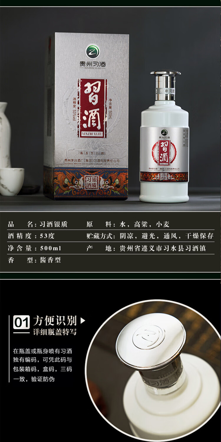 包装:瓶装;容量:500-749mL;香型:酱香型;产地:贵州;度数:50度及以上;酒精度:53%vol;容量:500ml;产品重量:1.13g;包装清单:习酒银质53度500ml X 1;