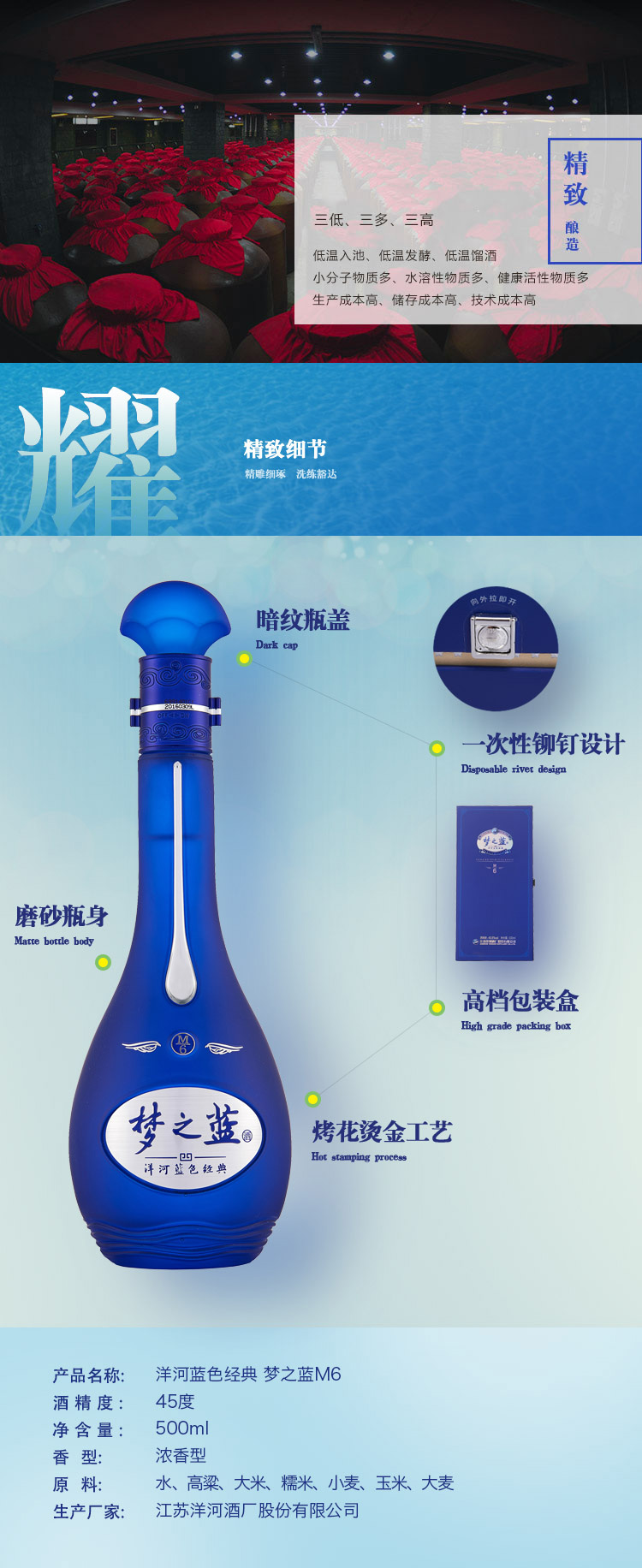 包装:瓶装;容量:376-499mL;香型:浓香型;度数:40-49度;香型:浓香型;产地:江苏;酒精度:45;包装:瓶装;产品重量:0g;容量:500;包装清单:梦之蓝M6 45度 单瓶装白酒500ml*1;