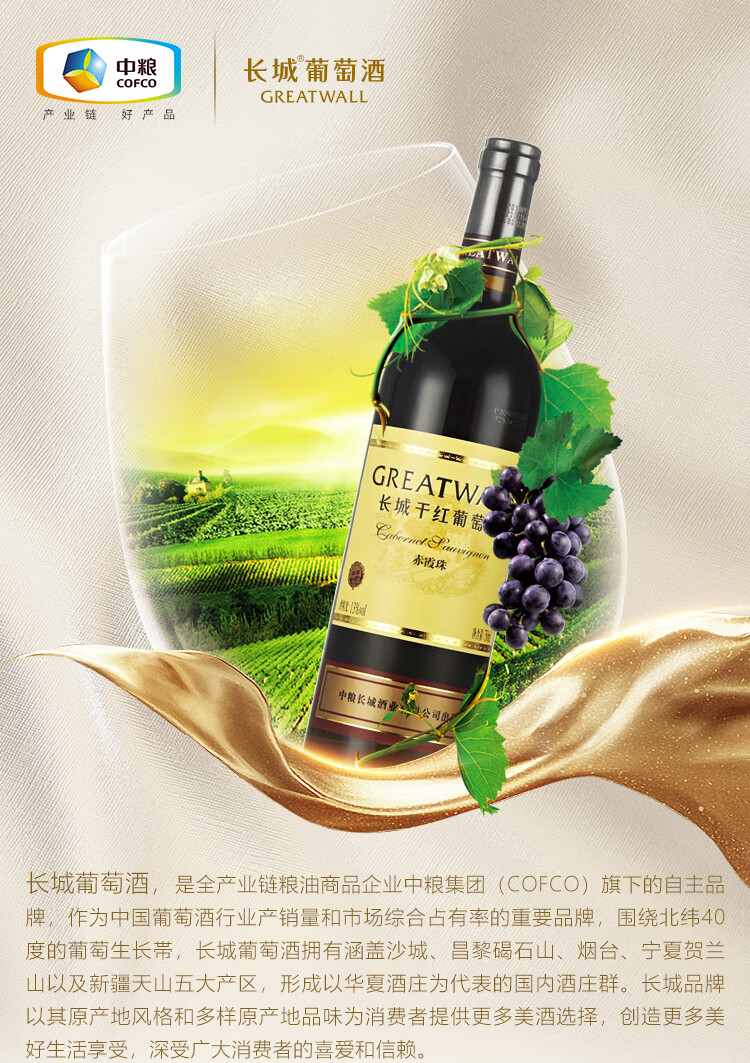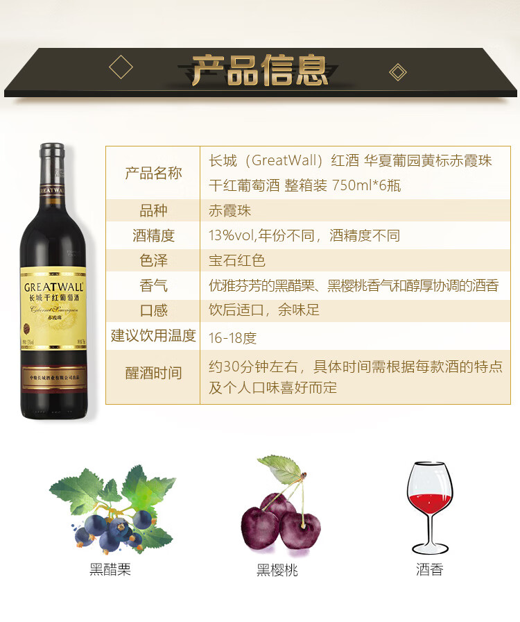 颜色:宝石红;口感:饱满;特性:其它;国产/进口:国产;适用场景:家庭聚会,礼节拜访,商务宴请,婚礼婚宴,情侣约会,自斟自饮,闺蜜私语,派对活动;包装:整箱装;酸度:中酸;类别:红葡萄酒;葡萄品种:赤霞珠(Cabernet Sauvignon);类型:静止酒;香型:果香;产地:中国大陆;容量:750mL;甜度:干型;保质期:3650天;酒精度:12.5%vol;原产地:中国大陆;存储方法:避免阳光直射,于5℃~25℃干燥通风处卧放或倒放为宜。;容量:750ml;产品重量:7.96kg;包装清单:华夏长城新赤霞珠干红葡萄酒 整箱装 750ml*6瓶;