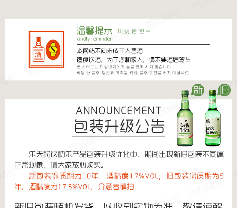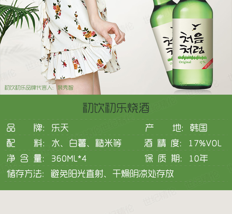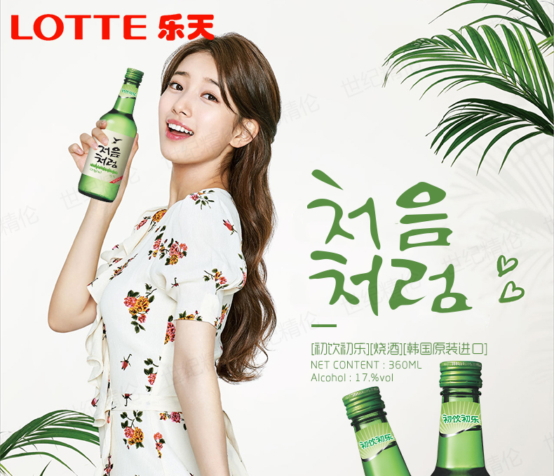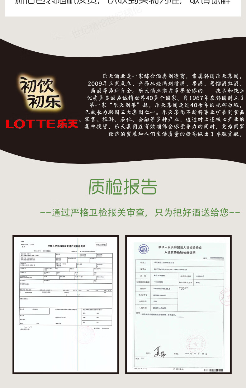 国产/进口:进口;产地:韩国;适用场景:闺蜜私语,情侣约会,商务宴请,亲友馈赠,自斟自饮,家庭聚会;包装:组合装;容量:1L及以上;原料:详情见包装;保质期:10年;酒精度:17%vol;存储方法:避免阳光直射,存放于阴凉干燥处;产品重量:2.7kg;包装清单:韩国进口 乐天(Lotte)初饮初乐 烧酒 组合装 360ml*4瓶*1;