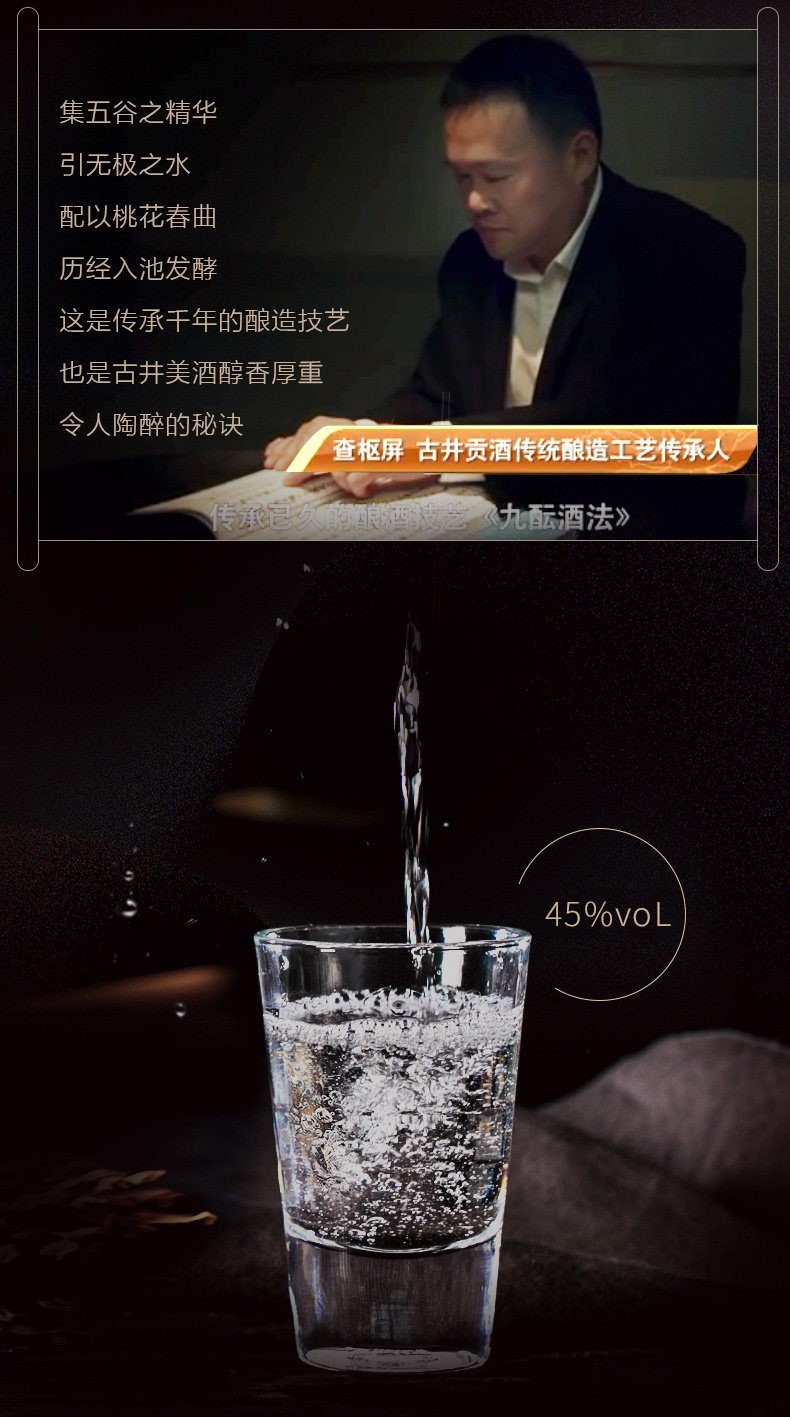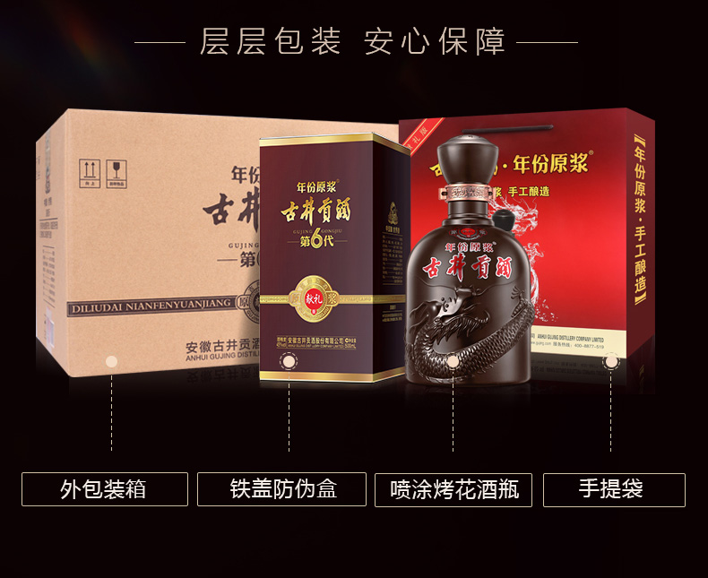 包装:整箱装;容量:376-499mL;香型:浓香型;产地:安徽;度数:40-49度;酒精度:45%vol;容量:500;产品重量:8650g;包装清单:古井贡酒年份原浆献礼版45度整箱装500ml*6瓶 礼品袋*3;