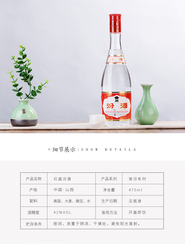 包装:整箱装;容量:750mL及以上;香型:清香型;产地:山西;度数:40-49度;酒精度:42%vol;容量:475ml;产品重量:11090g;包装清单:汾酒 玻汾 42度 475ml*12瓶 整箱装;