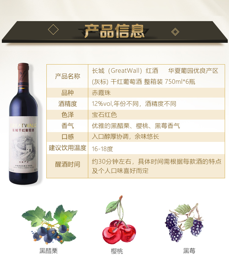 颜色:宝石红;口感:柔和;特性:普通餐酒;国产/进口:国产;适用场景:家庭聚会,礼节拜访,商务宴请,婚礼婚宴,情侣约会,自斟自饮,闺蜜私语,派对活动;包装:整箱装;酸度:中酸;类别:红葡萄酒;葡萄品种:赤霞珠(Cabernet Sauvignon);类型:静止酒;香型:果香;产地:中国大陆;容量:750mL;甜度:干型;系列:华夏葡园;保质期:3650天;酒精度:12%vol;原产地:中国大陆;存储方法:避免阳光直射,于5℃~25℃干燥通风处卧放或倒放为宜。;容量:750ml;产品重量:7.94kg;包装清单:华夏长城优良产区(灰标)干红葡萄酒 整箱装 750ml*6瓶;