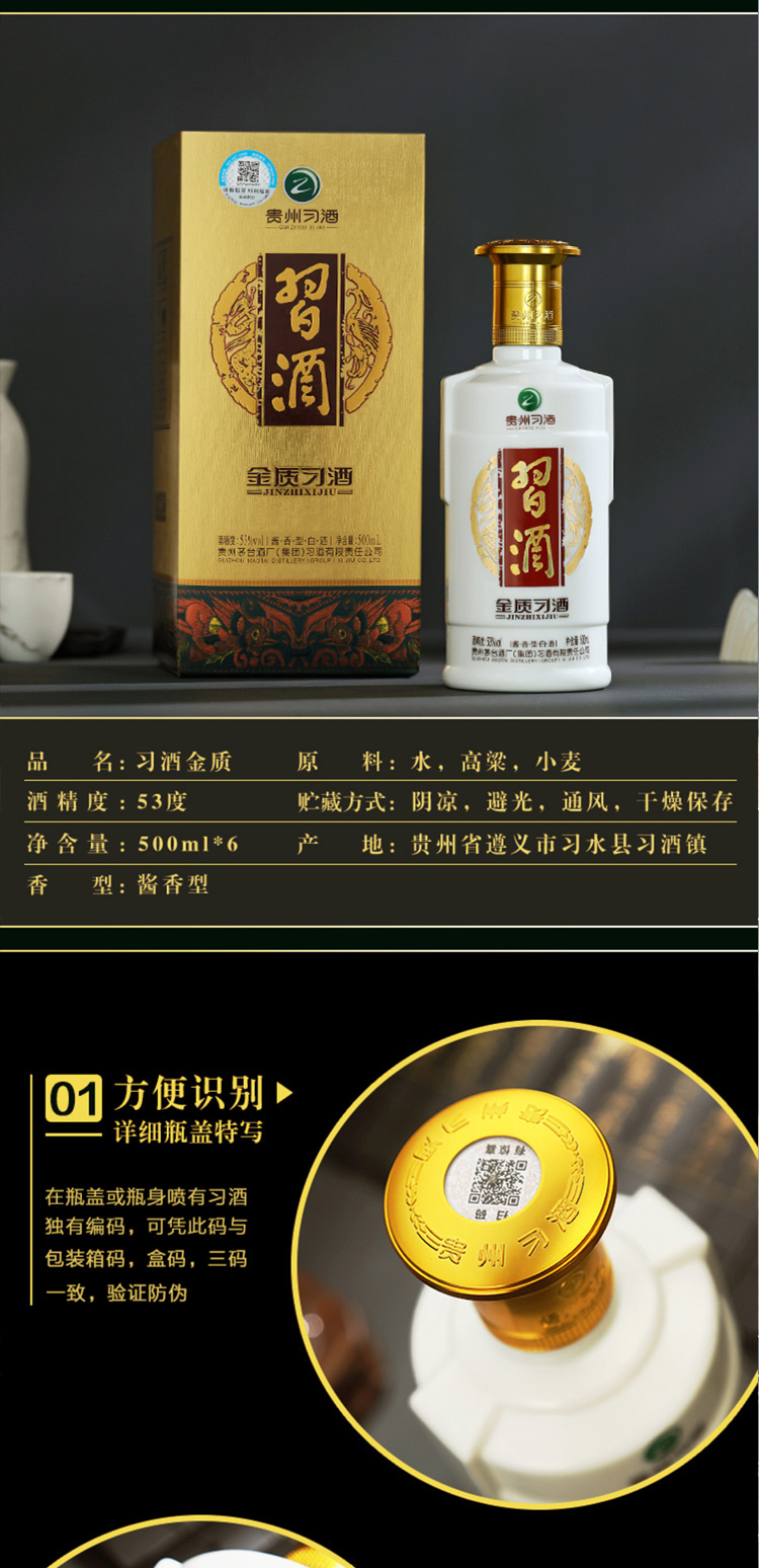 包装:整箱装;容量:500-749mL;香型:酱香型;产地:贵州;度数:50度及以上;酒精度:53%vol;容量:3000ml;产品重量:7.72g;包装清单:习酒金质 53度 500ml X 6;